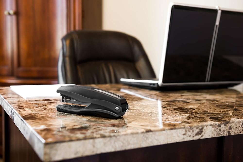 • ERGONOMIC AND HEAVY-DUTY: Experience comfort with its ergonomic design, making it a go-to heavy-duty office stapler; the soft cap and base ensure a firm grip and desktop protection, offering a seamless stapling experience without hand fatigue