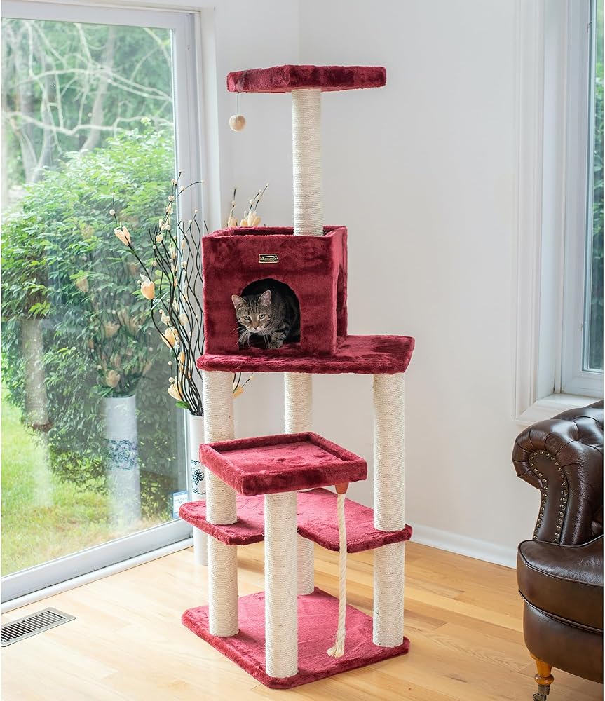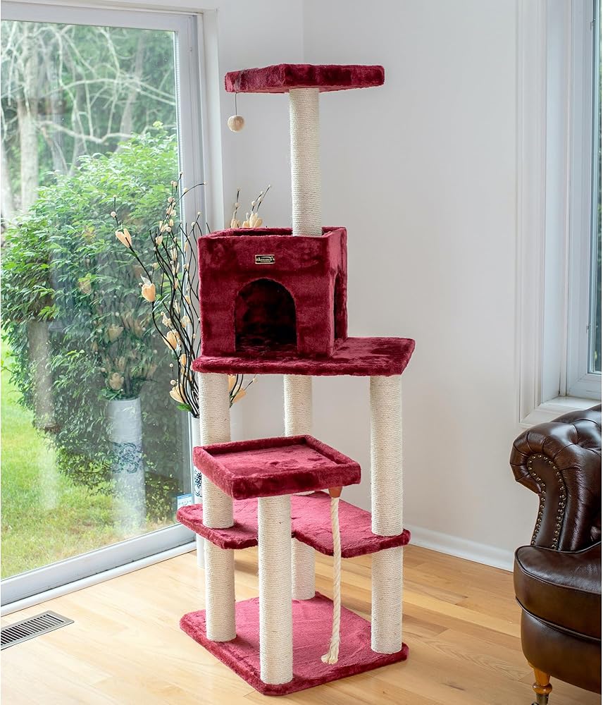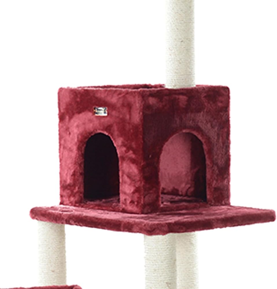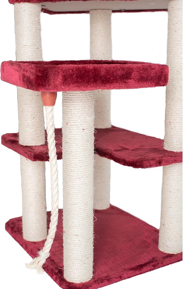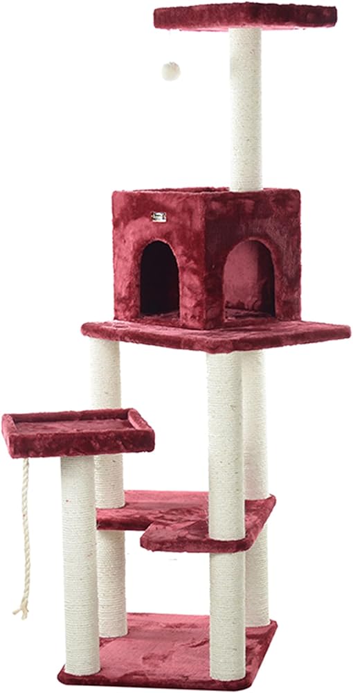 Armarkat model no. A6902B features a thick swinging sisal rope toy, hanging ball toy, playhouse, multiple perches and scratching posts for your cats to enjoy. F and B Bullet: 69" height, burgundy with high density and ultra-thick faux fur covering for felines comfort and soft, coverings are permanently adhered to wood structures. Well constructed of 15mm pressed wood material, making it not only thicker but stronger. 100% Natural, seasoned sisal rope wraps all posts securely for years of scratching. Dimensions:post diameter: 3.5"; base: 24" x 20"; playhouse: 15"(W) x 12"(H); perch: 14" x 14"; Max holding weight: 40 lbs. Six-months warranty included. Replacement parts available from manufacturer.