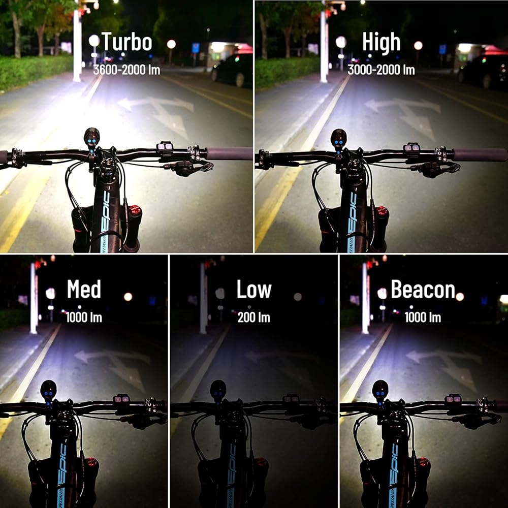 • 5 أوضاع إضاءة: يحتوي ضوء الدراجة على 5 أوضاع إضاءة: توربو/عالية/متوسطة/منخفضة/منارة، مجهزة بوحدة تحكم لسهولة التشغيل، يمكنك ضبط أوضاع إضاءة مختلفة وفقًا للبيئة المحيطة لضمان الركوب بأمان في الليل.