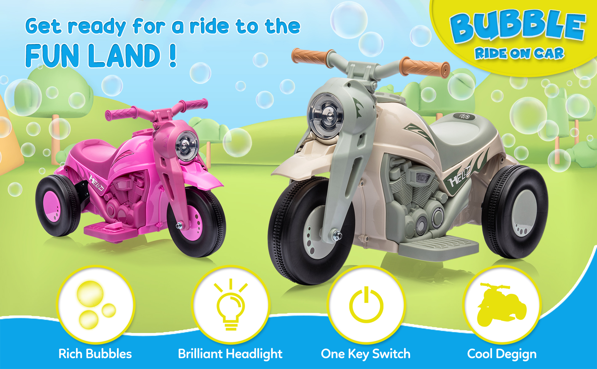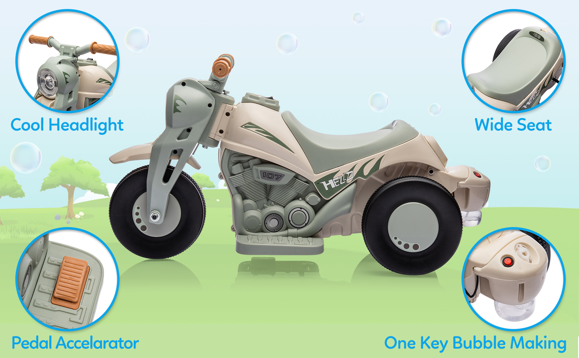 【سيارة الفقاعات】: عزز متعة دراجة الأطفال النارية هذه باستخدام آلة الفقاعات المدمجة في الخلف. بضغطة زر بسيطة، تنتج فقاعات نابضة بالحياة، مما يضيف لمسة مبهجة إلى تجربة الركوب للأطفال. (يرجى ملاحظة: محلول الفقاعات غير متضمن)