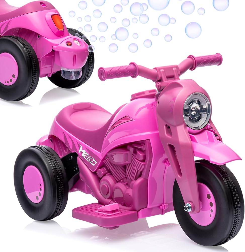 دراجة نارية للأطفال مع وظيفة الفقاعات، باتيكوين 6 فولت فقاعة دراجة نارية للركوب على لعبة سيارة للأطفال مع مصابيح أمامية LED، موسيقى، للأمام/الاحتياطي، دواسة، 3 عجلات للركوب على دراجة نارية للأطفال 3-8 بنين بنات، وردي