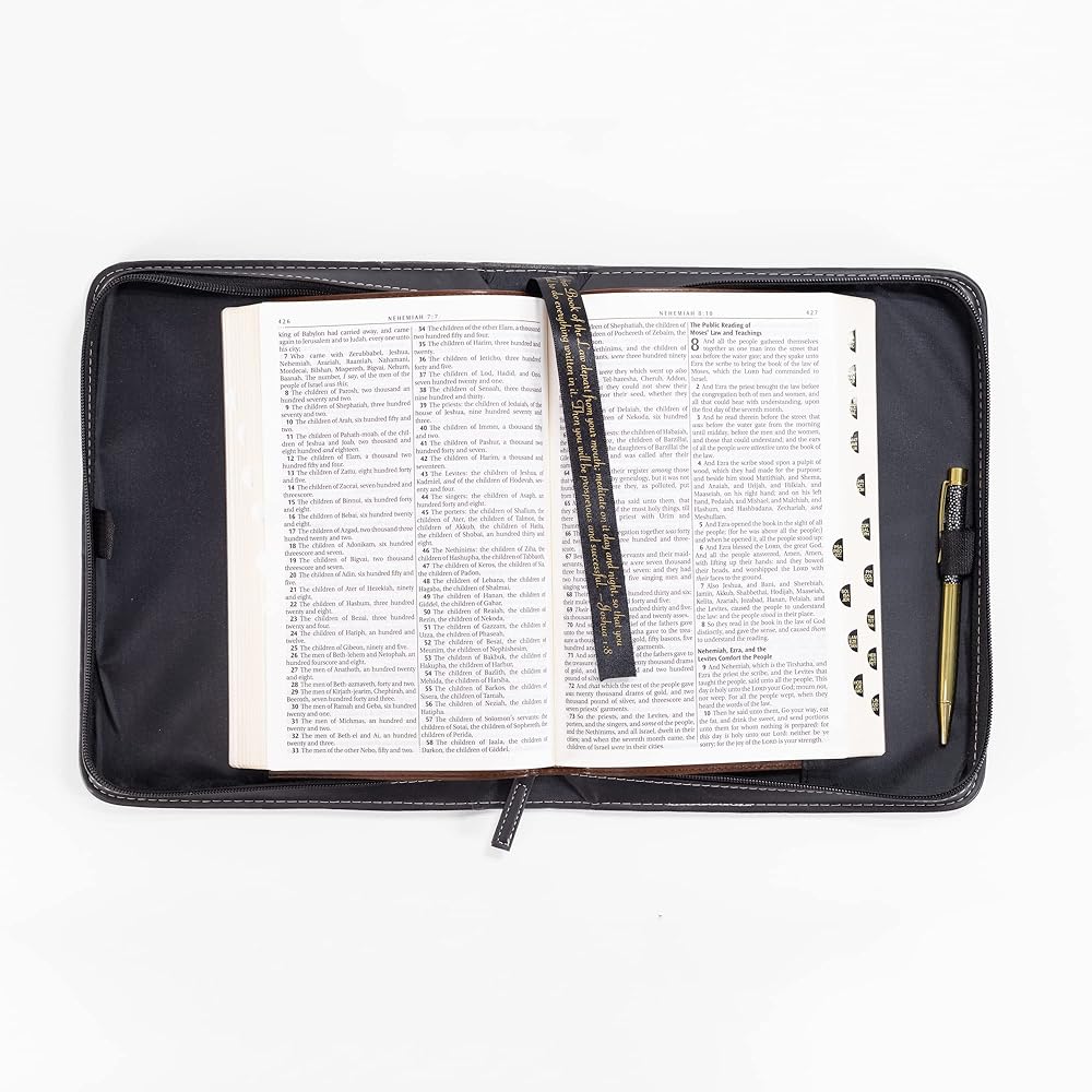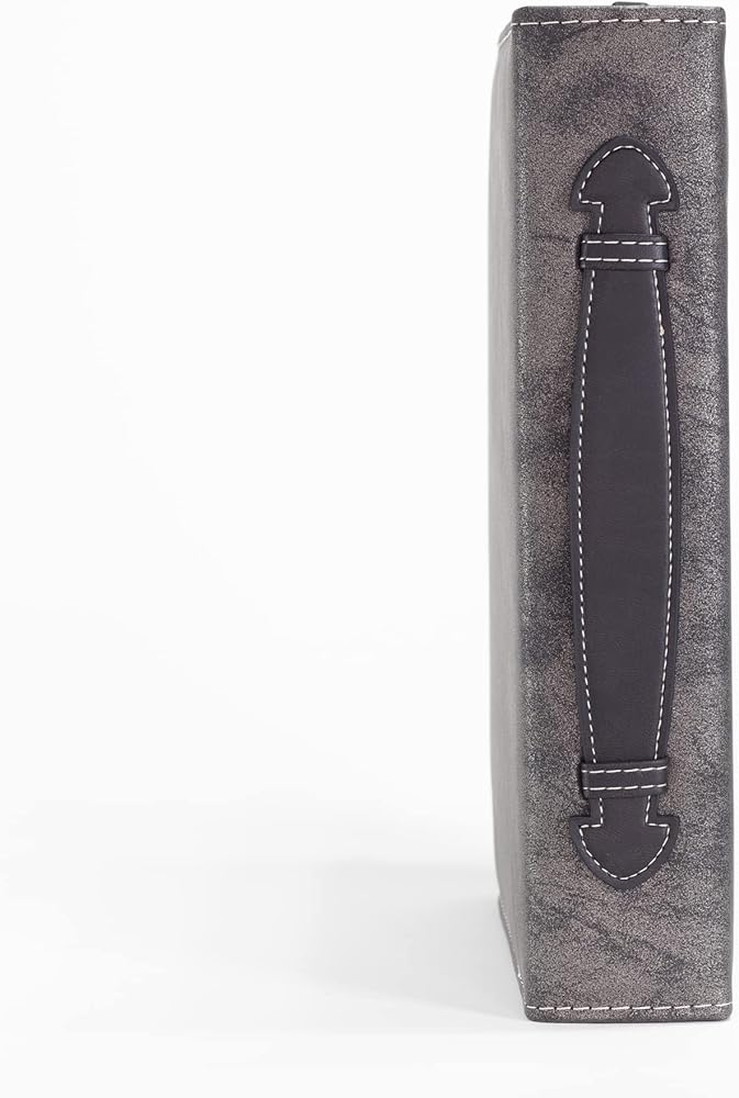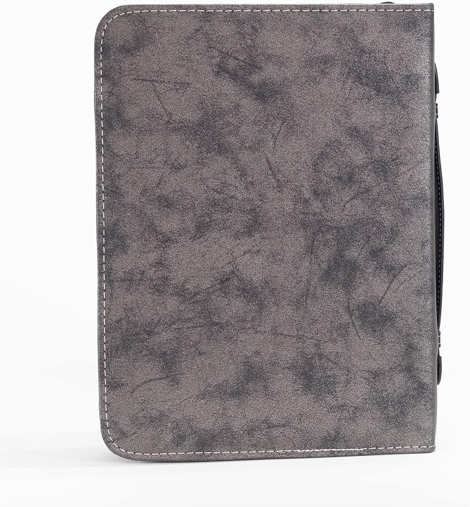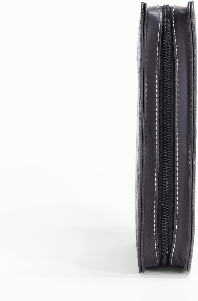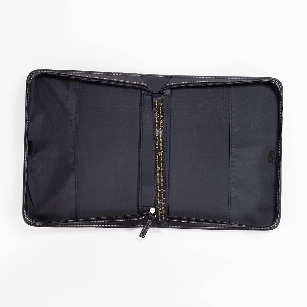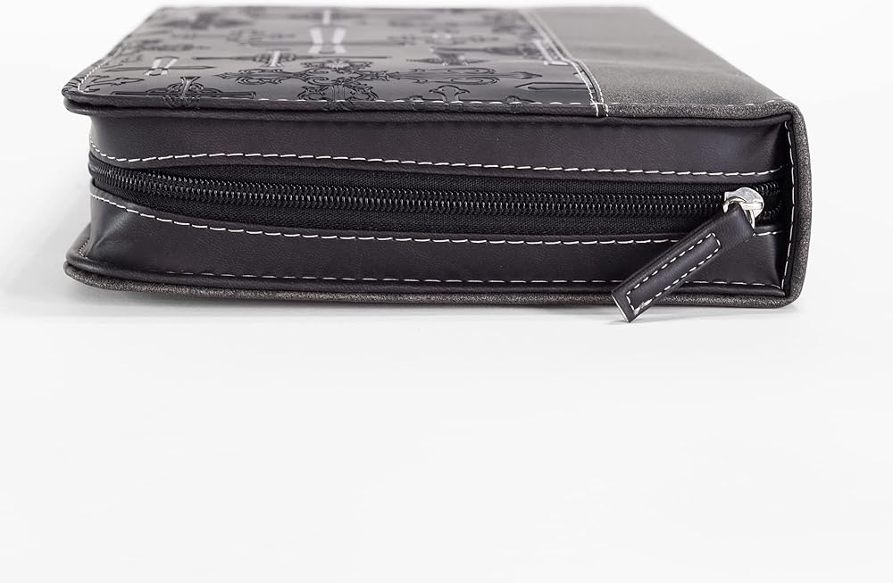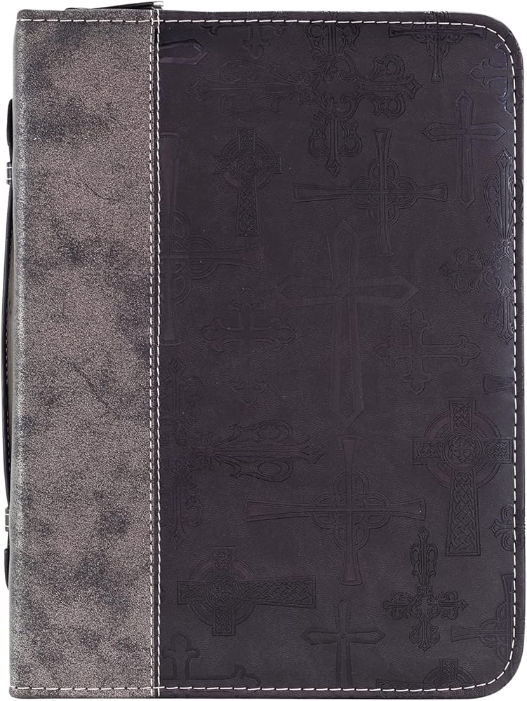Cross Design Bible Cover features many different crosses across the cover. Cover is made of polyurethane faux leather with midnight black and silver tone finish. Bible cover is size x-large and measures approximately 11 x 8 x 2 inches. Embellished with applique and hot stamp features; Includes zippered closure and spine carrying handle. Ships in protective packaging.