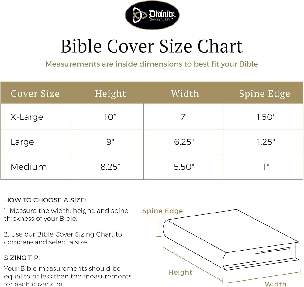 Bible cover is size x-large and measures approximately 11 x 8 x 2 inches