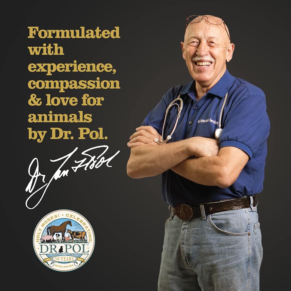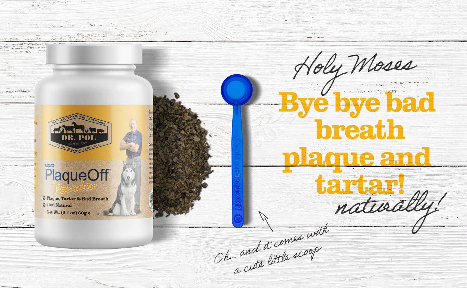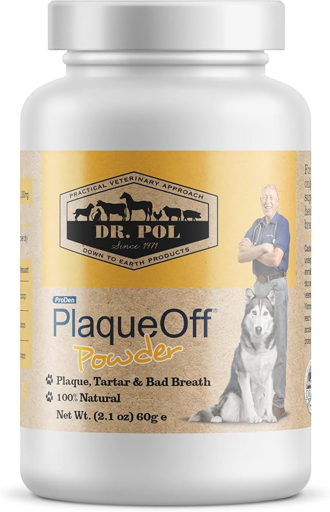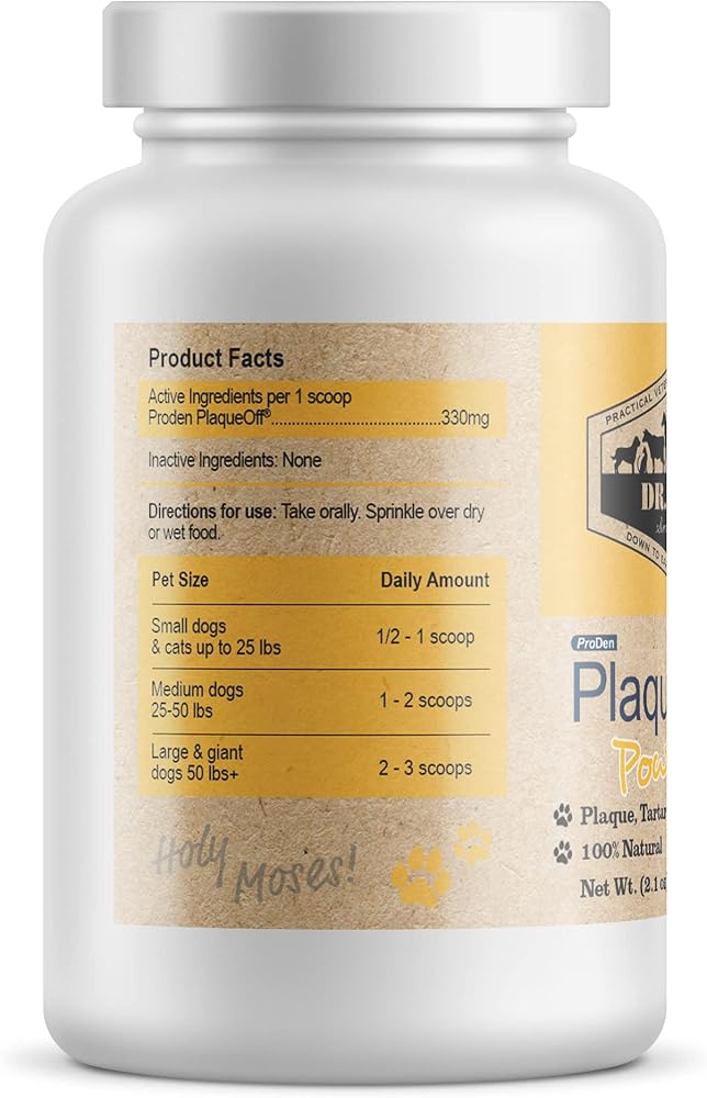 Be gone, dog breath! Dr. Pol's ProDen PlaqueOff Powder for Dogs and Cats is formulated with a clinically-tested dental care ingredient, a seaweed called Ascophyllum nodosum. This natural ingredient acts as a dog and cat breath freshener by helping reduce plaque and tartar buildup. Plaque Off for dogs and cats is backed by two double-blind studies which found the ProDen Plaque Off Powder to be beneficial for pet's daily oral care. This easy-to-use cat and dog plaque remover powder makes it simple to give your furry friend a daily dose; simply sprinkle this cat and dog teeth cleaner powder of their food once daily, and you can see its dog and cat teeth cleaning power over time. The formulation of this proven-effective plaque remover for dogs and cats is 100% natural with no gluten, no added sugar, no additives, and no artificial preservatives. Cat and dog oral care doesn't only mean fresher dog breath; the health of your pet's teeth can affect their overall wellness. That's why it's vital to use preventative pet dental care products with wholesome ingredients. ProDen Plaque Off for dogs and cats works from within with natural ingredients to help improve oral health for cats and dogs.