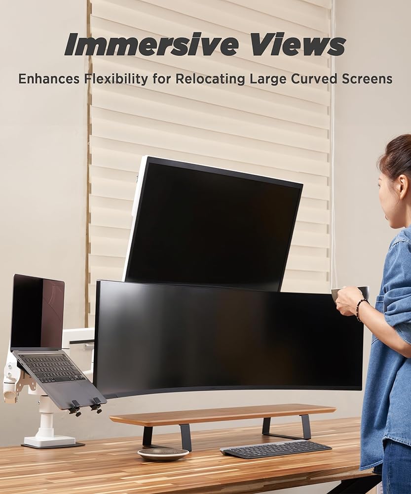 يناسب الشاشات فائقة العرض - يحمل شاشة واحدة يصل وزنها إلى 44 رطلاً. يناسب الشاشات فائقة العرض حتى 57 بوصة والمتوافقة مع الأسفل مقاس 49 بوصة إلى 24 بوصة مسطحة ومنحنية حتى 1000R. تتمتع شريحة VESA سريعة التحرير بقدرة تركيب 75 × 75 مم و100 × 100 مم.