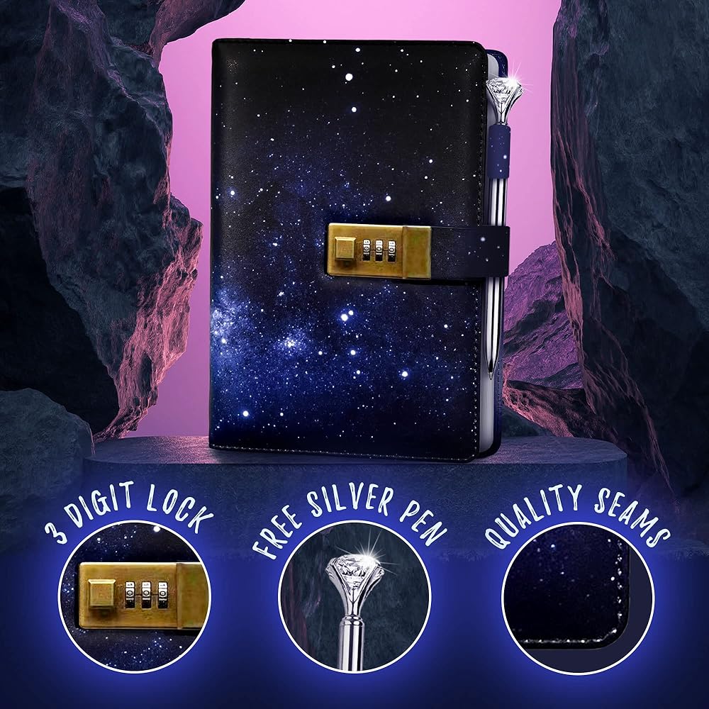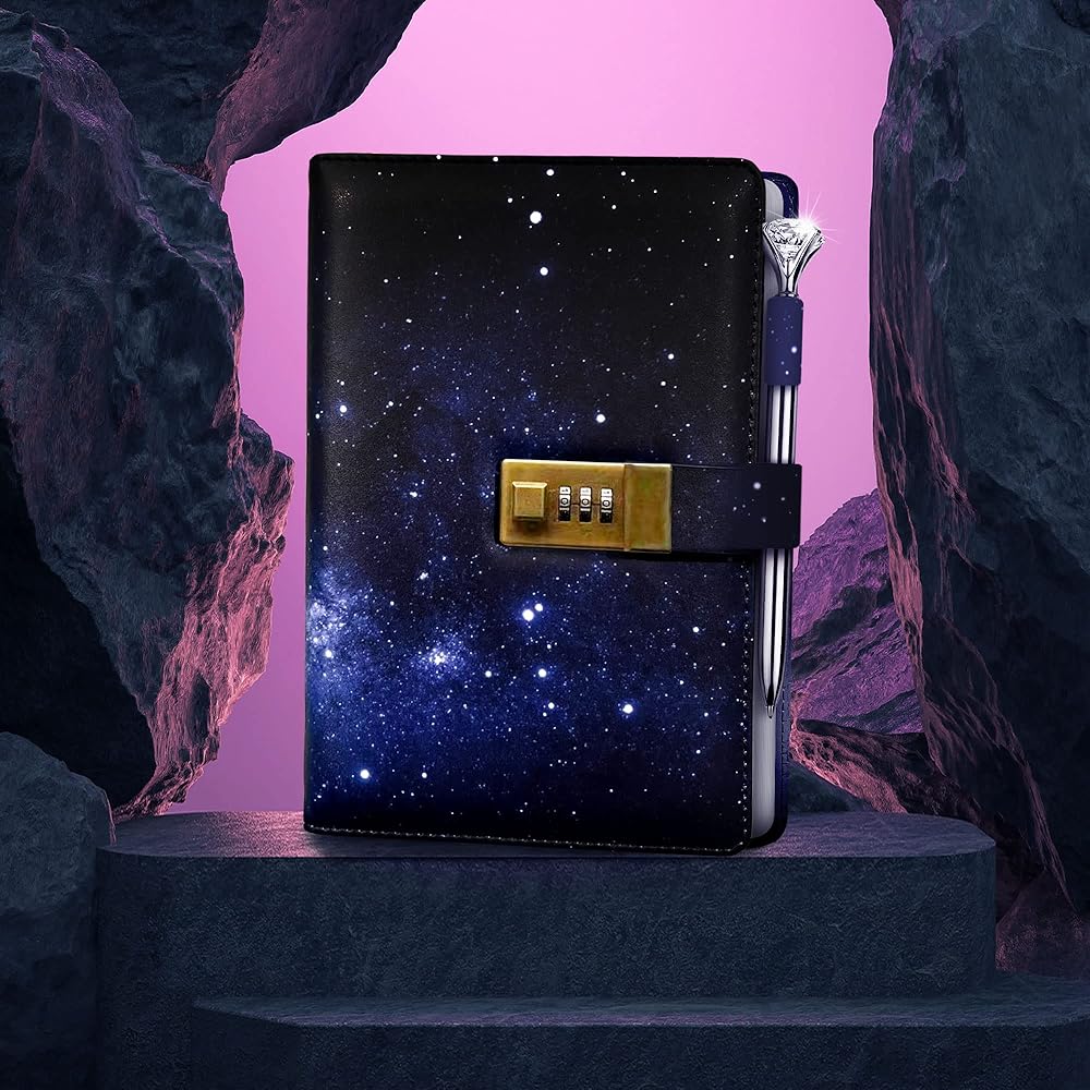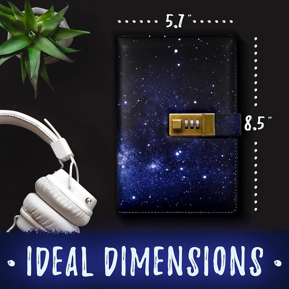 [تصميم داكن] نحن نصنع أحدث مجلة قابلة للقفل بتصميم سماء الليل باللون الأزرق الداكن في السوق! مع المجلة الجلدية ذات القفل، ستشعر بشعور رائع بالكتابة في مجلة ذات ألوان زاهية - تعزز الشعور بالمرح في مساحتك الخاصة! لم يكن أي من عملائنا مسرورًا بمجموعاتنا!