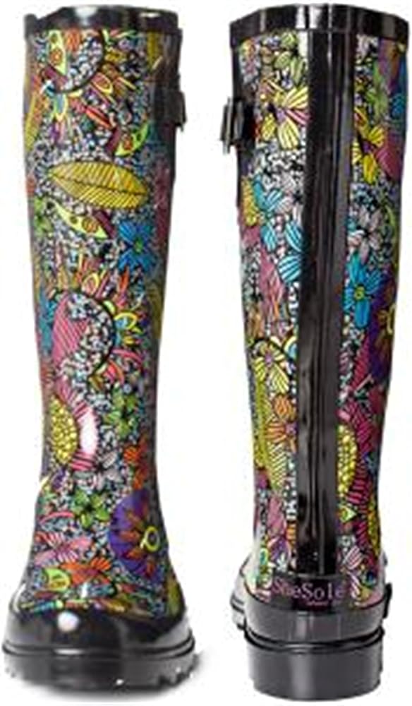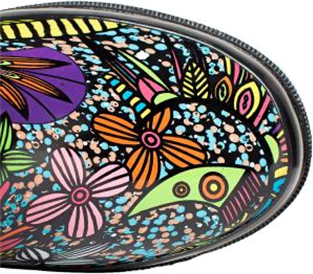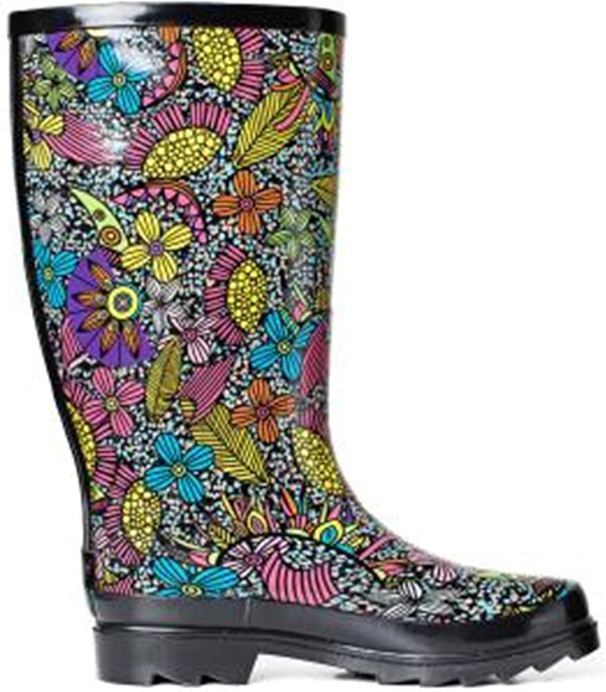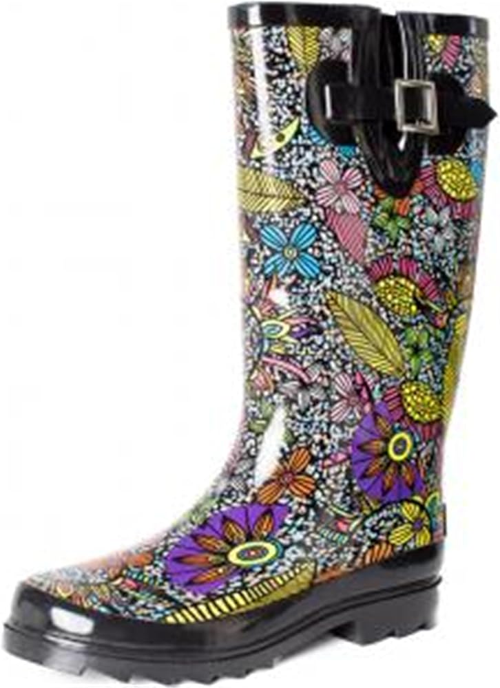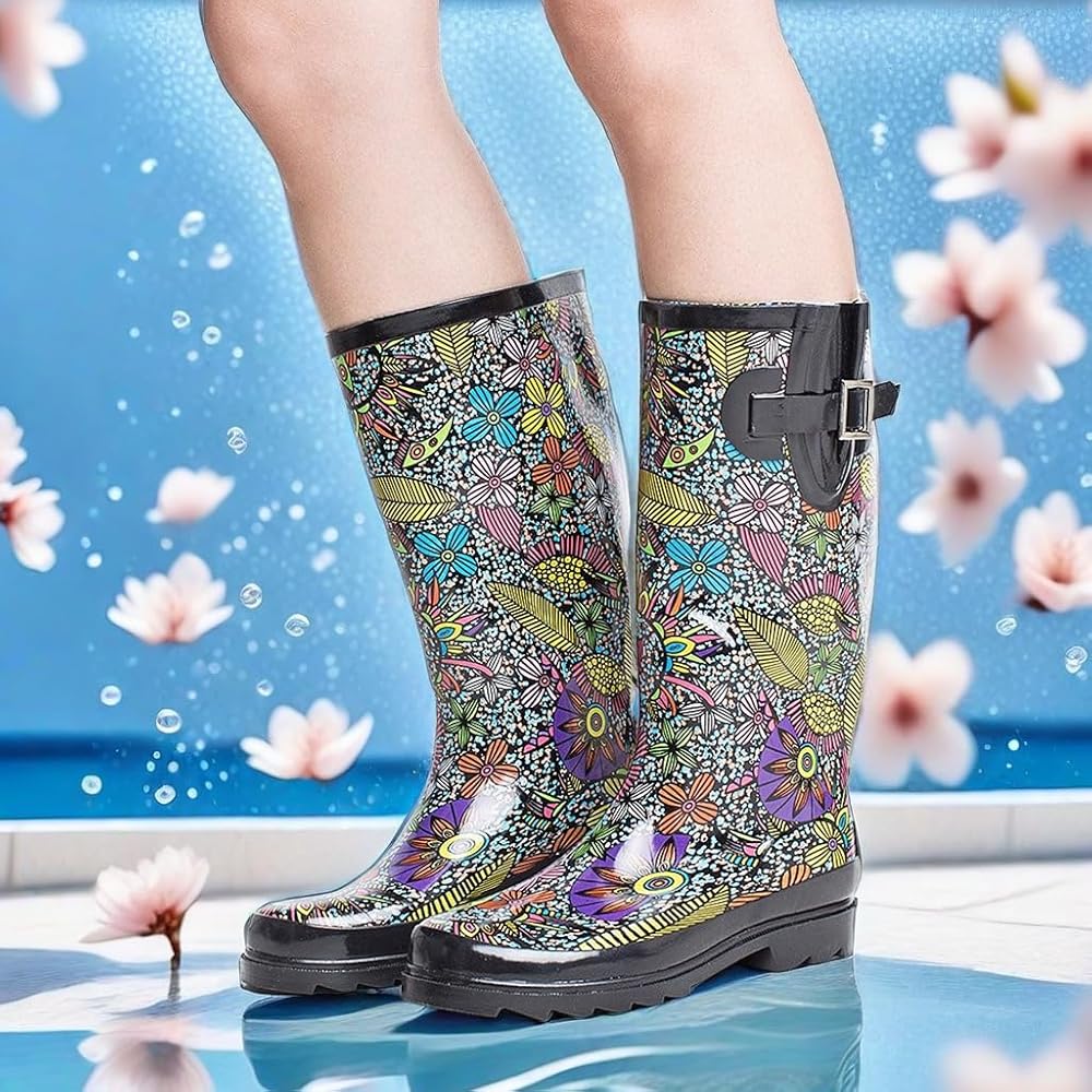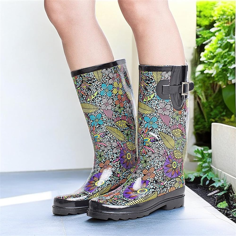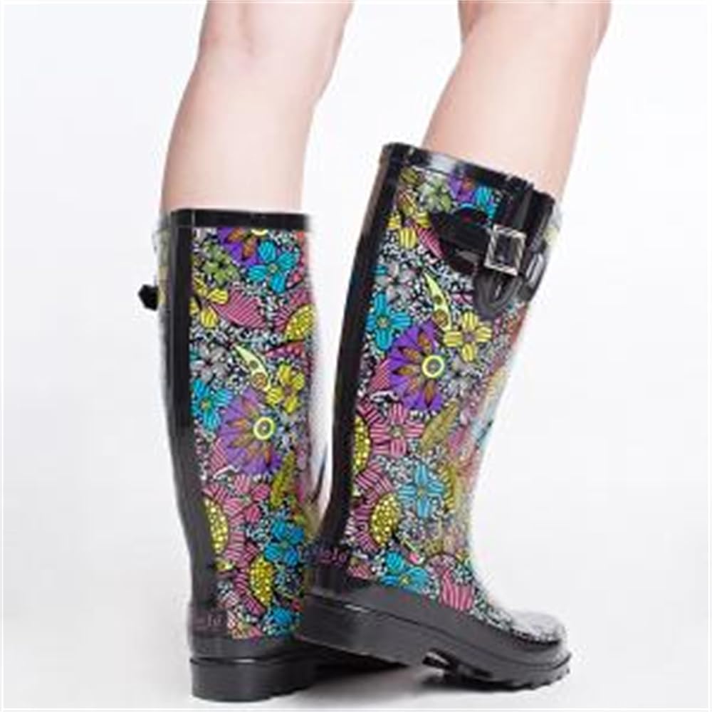 حذاء SheSole نسائي طويل من المطاط المقاوم للماء للحديقة، متوسط ​​الساق، مطبوع عليه زهور، أسود، مقاس أمريكي 6