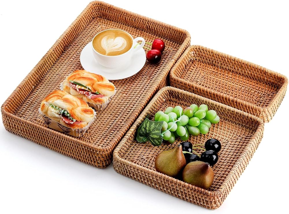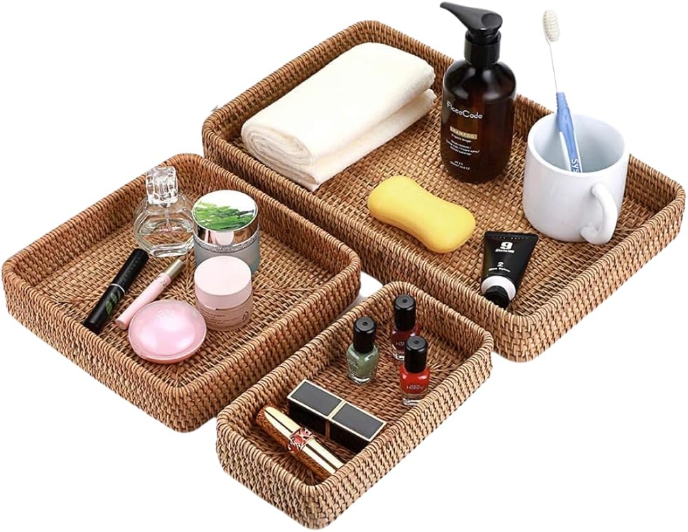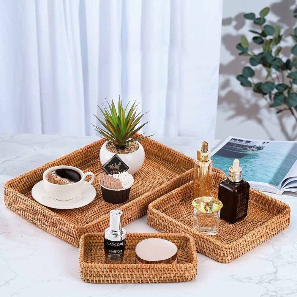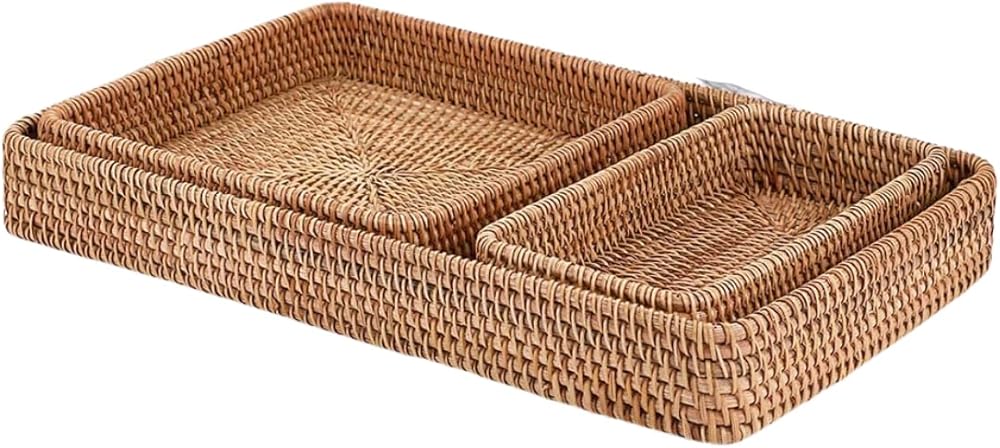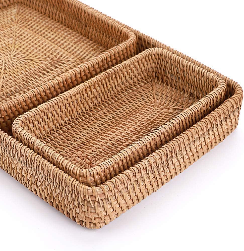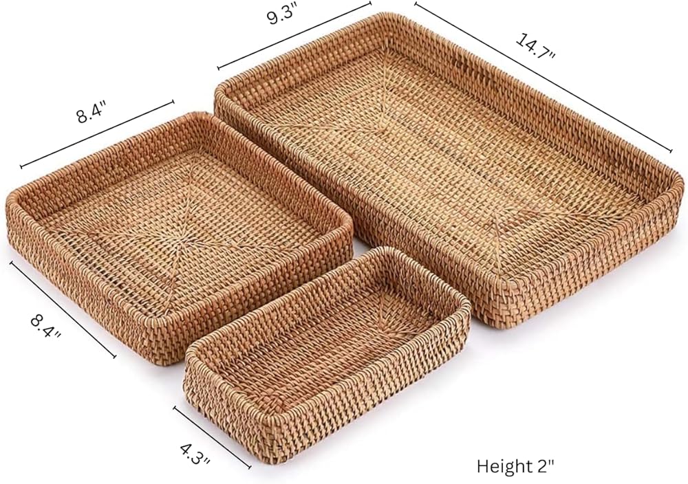 This stylish rattan tray set makes organizing and displaying items a breeze. Crafted from durable yet lightweight rattan, this set includes three woven baskets and trays in graduated sizes that can be used on counters, tables, desks, and more. Keep bath and beauty essentials corralled in the bathroom, organize office supplies, or use these trays to serve snacks or display décor. The neutral natural color and openweave design allow them to complement any style. At under 12 inches long, these baskets are perfectly sized to corral smaller items without taking up excessive space. Wipe clean as needed to keep them looking their best for years of use.