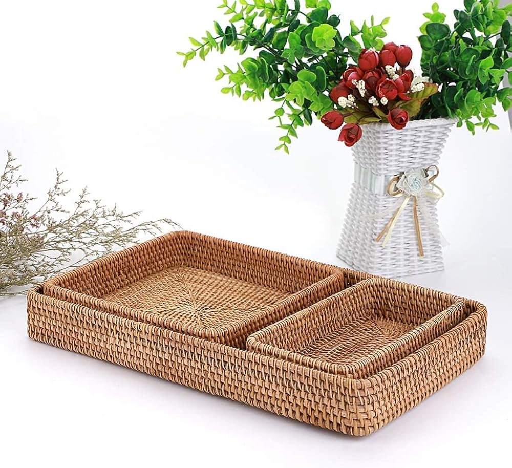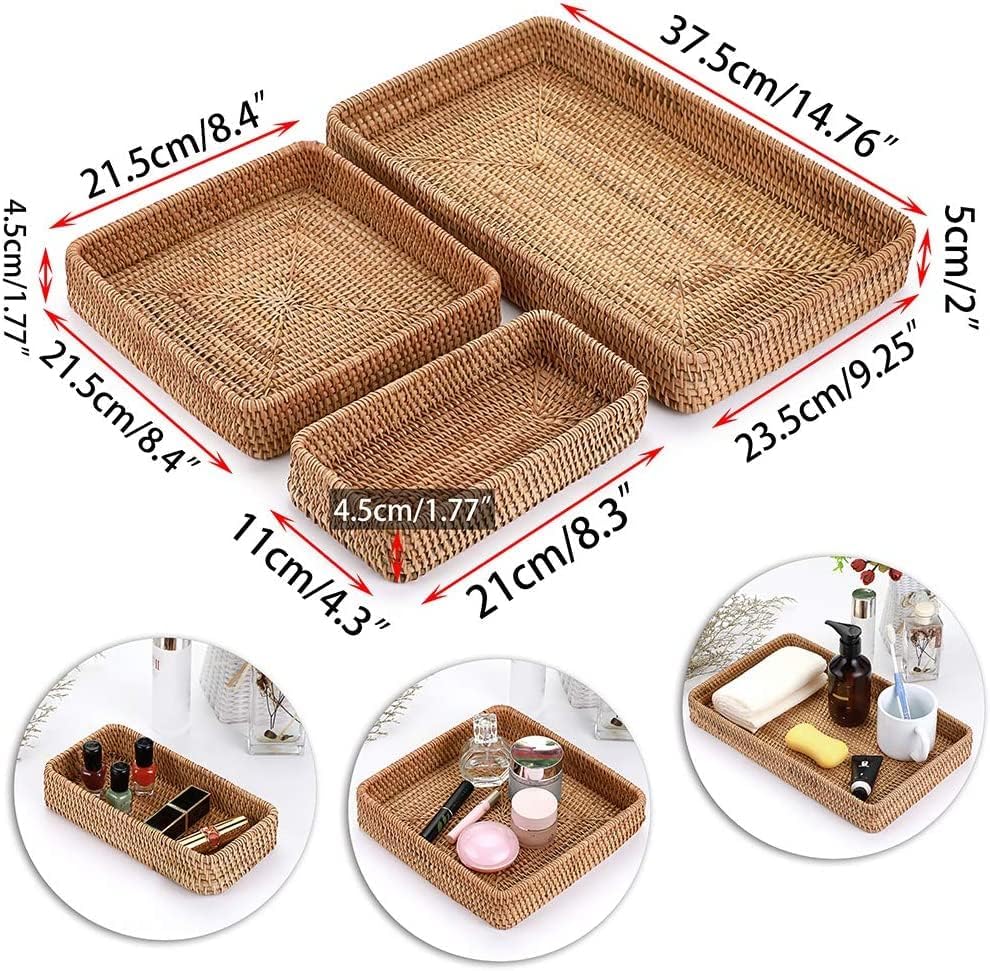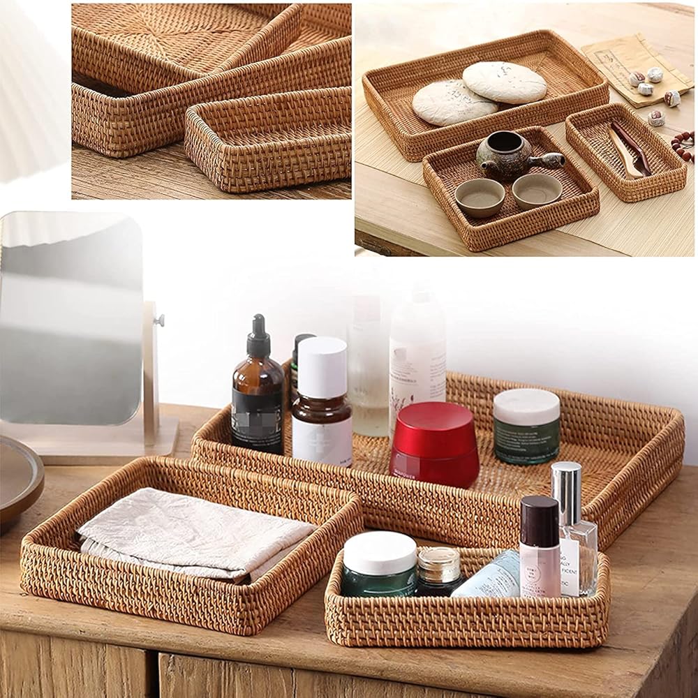 • VERSATILE STORAGE: This set of 3 rattan baskets, tray and shelf provide stylish storage solutions for countertops, desks, bathrooms and more around the home.