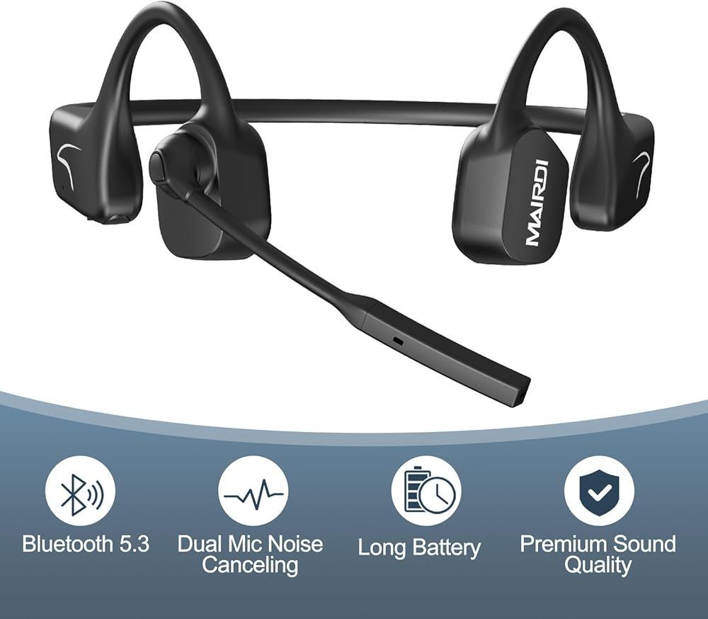 سماعة رأس لاسلكية من MAIRDI مع ميكروفون بوم، سماعة رأس بلوتوث مفتوحة الأذن مع ميكروفون AI لإلغاء الضوضاء، سماعة رأس لاسلكية للعمل المكتبي والقيادة الرياضية والجري وركوب الدراجات