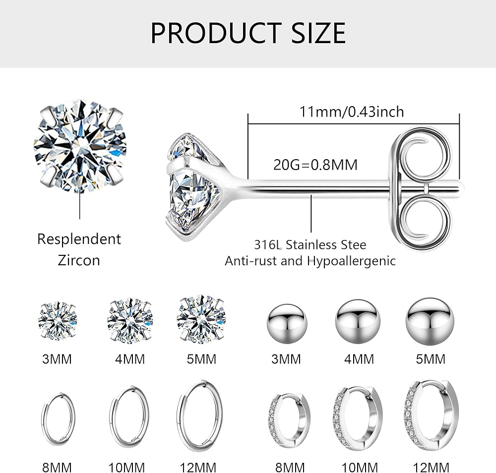 【حجم الأقراط النسائية والرجالية】3 أزواج من الأقراط المرصعة بالزركونيا المكعبة (5 مم، 4 مم، 3 مم)، 3 أزواج من الأقراط الكروية (5 مم، 4 مم، 3 مم)، 3 أزواج من الأقراط الحلقية الصغيرة القطر الداخلي: (8 مم، 10 مم، 12 مم). 3 أزواج من الأقراط الحلقية تشيكوسلوفاكيا القطر الداخلي: (7 مم، 10 مم، 12 مم). هذه الأقراط المضادة للحساسية هي الحجم المناسب لمعظم الأشخاص لارتدائها. تحظى أنماط وأحجام الأقراط بشعبية كبيرة وهي خيار قوي لأولئك الذين لديهم الكثير من الآذان المثقوبة.