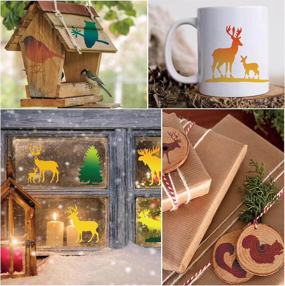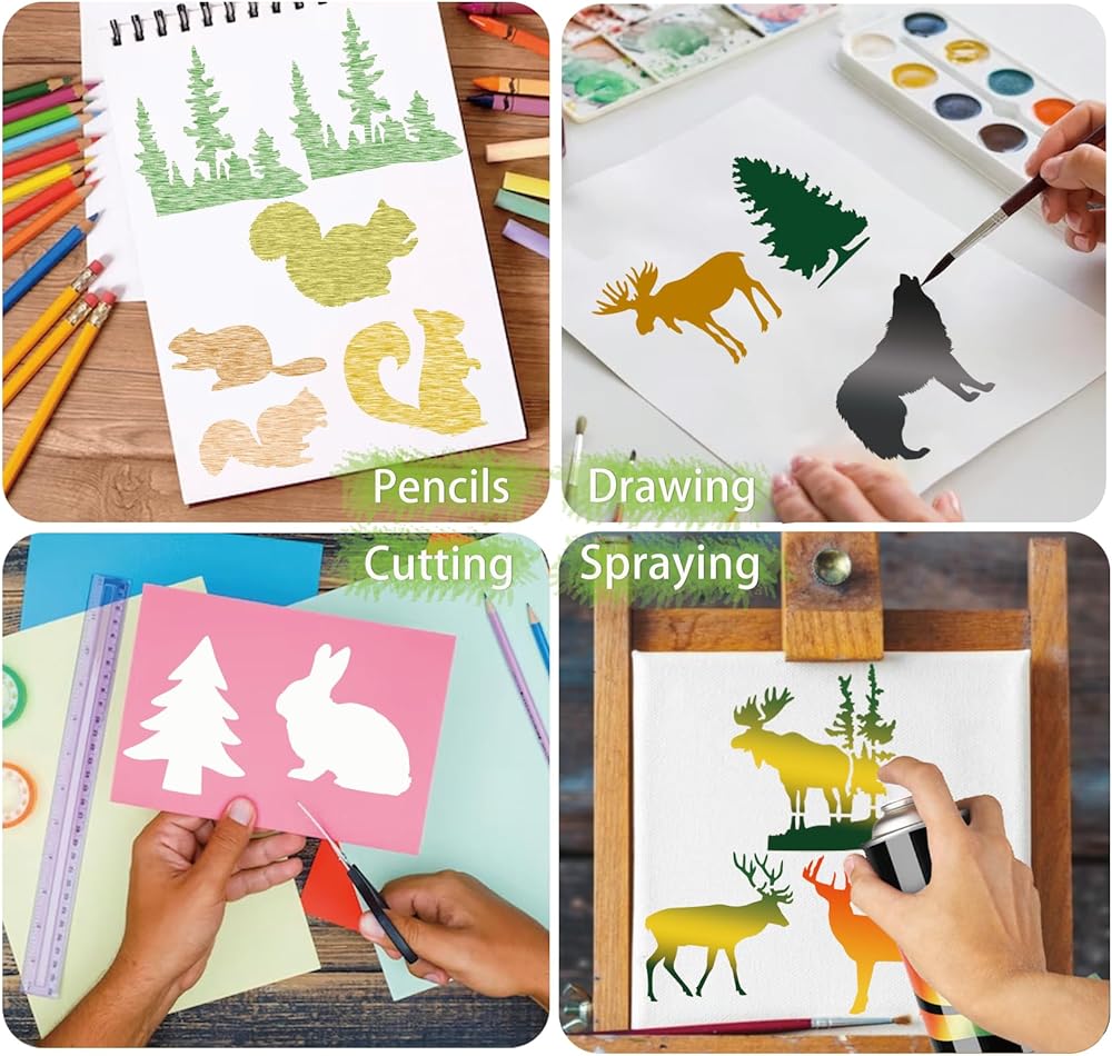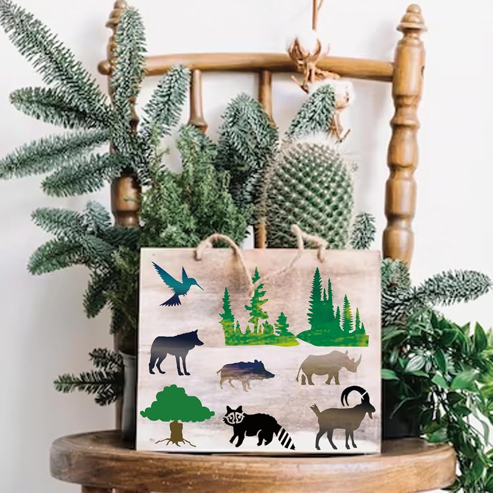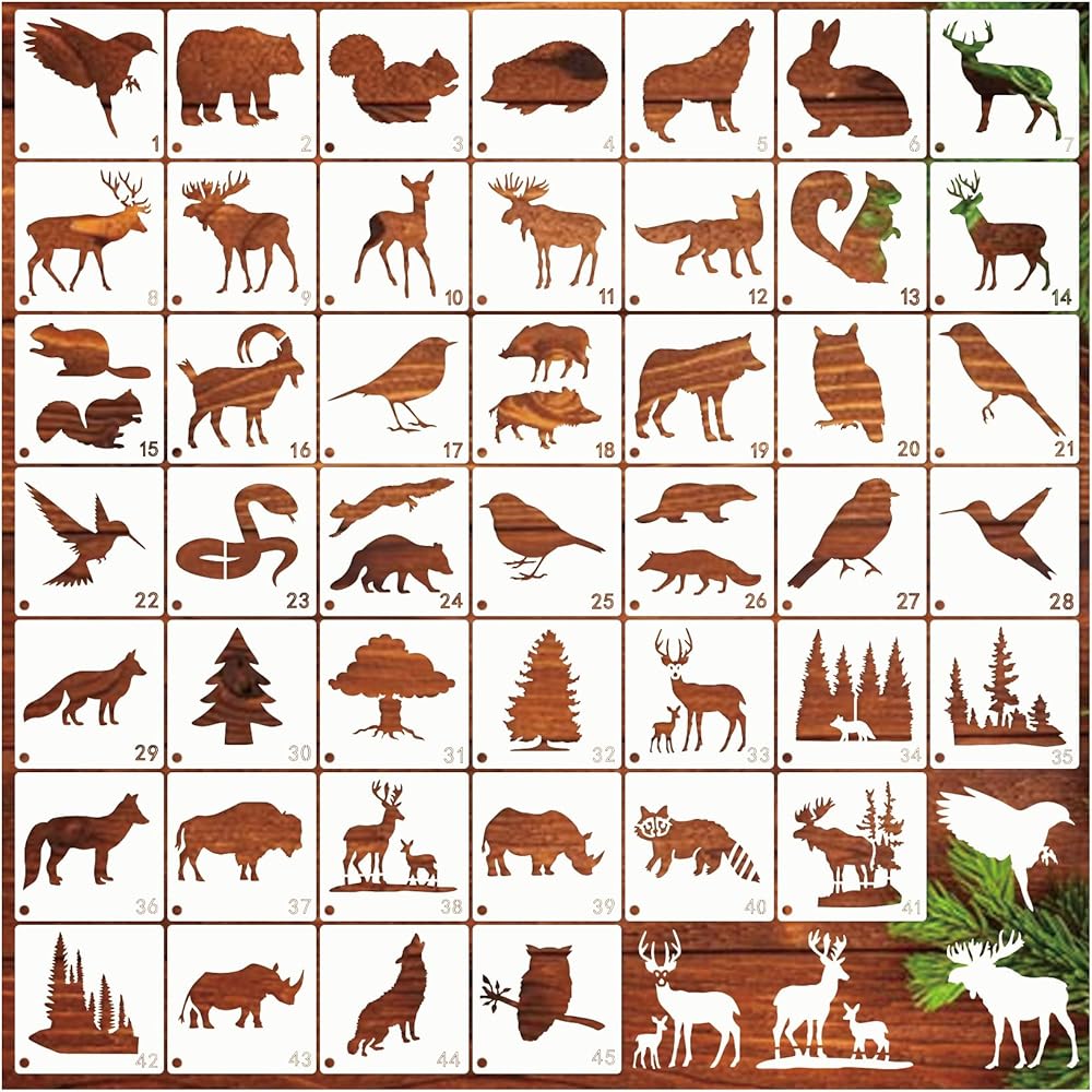 45 قطعة من استنسل حيوانات الغابة للرسم على استنسل شجرة الحياة البرية الخشبية، أنماط حرق الحياة البرية، قالب الدببة الغزلان على قماش جداري فني من القماش الصخري (45 حياة برية)