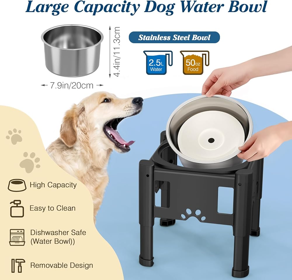 【Easy to Clean】Stainless steel dog water bowl is rust-resistant and shock-proof, the detachable design allows you to detach the dog bowl from the stand and wash it in the dishwasher, is easy to clean, and can be reused for a long time.