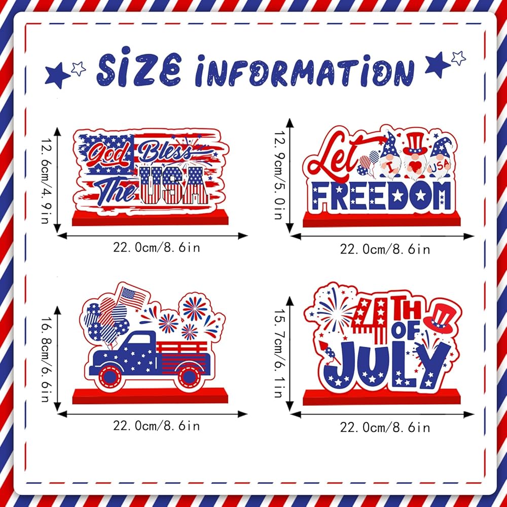 Fitting Size: Our 4th of July decorations come in a total of four patterns, with the American Flag table decorations measuring approximately 8.6x4.9 inches, the gnome pattern table decorations measuring approximately 8.6x5.0 inches, the truck pattern table decorations measuring approximately 8.6x6.6 inches, and the 4th of July lettering pattern measuring approximately 8.6x6.1 inches. This 4th of July decorations are just the right size to not only have a strong presence to decorate the scene, but also not too big to take up too much space.