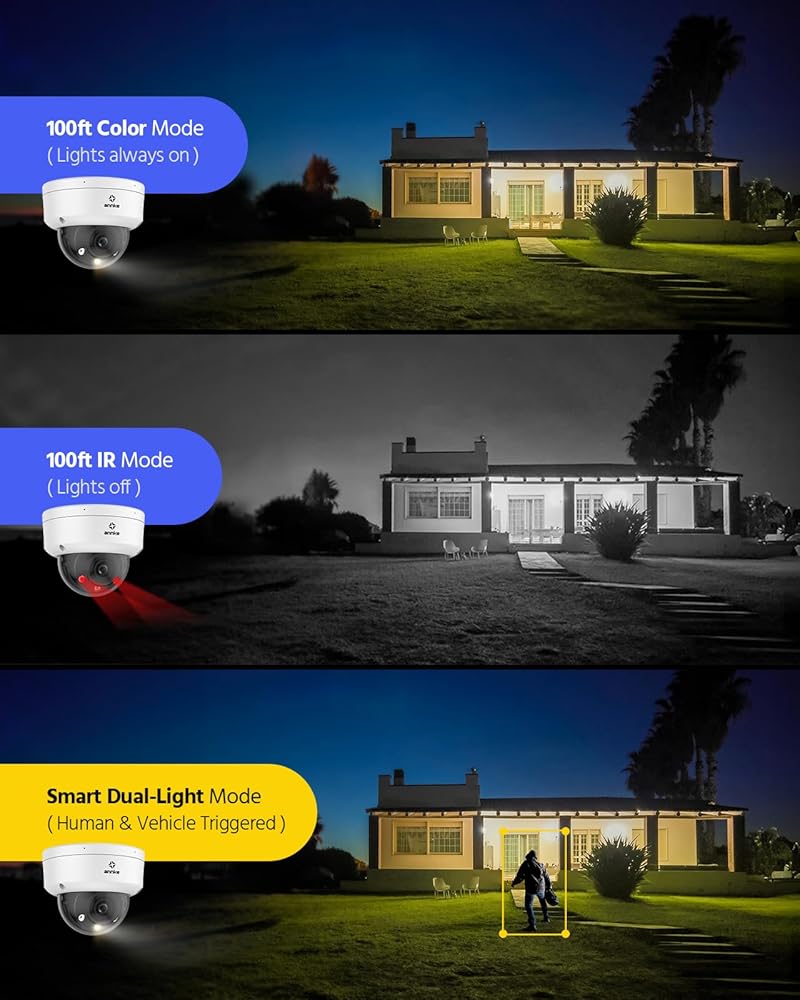 【رؤية ليلية رائعة بالألوان الكاملة】 3 أوضاع إضاءة تساعدك على التكيف مع بيئات مختلفة: الإضاءة الذكية الافتراضية المزدوجة، والرؤية الليلية بالألوان الكاملة (الأضواء تعمل دائمًا) والرؤية الليلية بالأشعة تحت الحمراء (الأضواء مطفأة). سيبدأ الوضع في ملء الضوء فقط للكشف عن حركات الإنسان والمركبة، مما يعطي المزيد من الألوان للأحداث التي تحدث في الليل، بينما يعمل بقية الوقت في وضع الأشعة تحت الحمراء، مما يتجنب تمامًا مشاكل الإضاءة طويلة المدى.