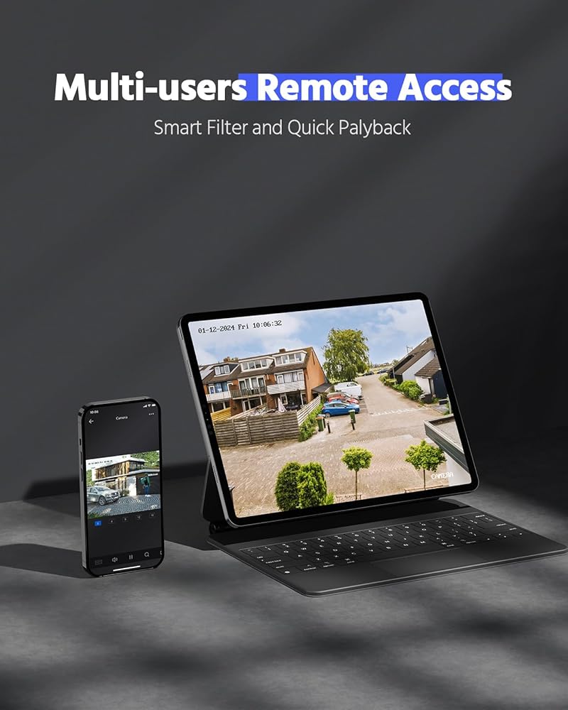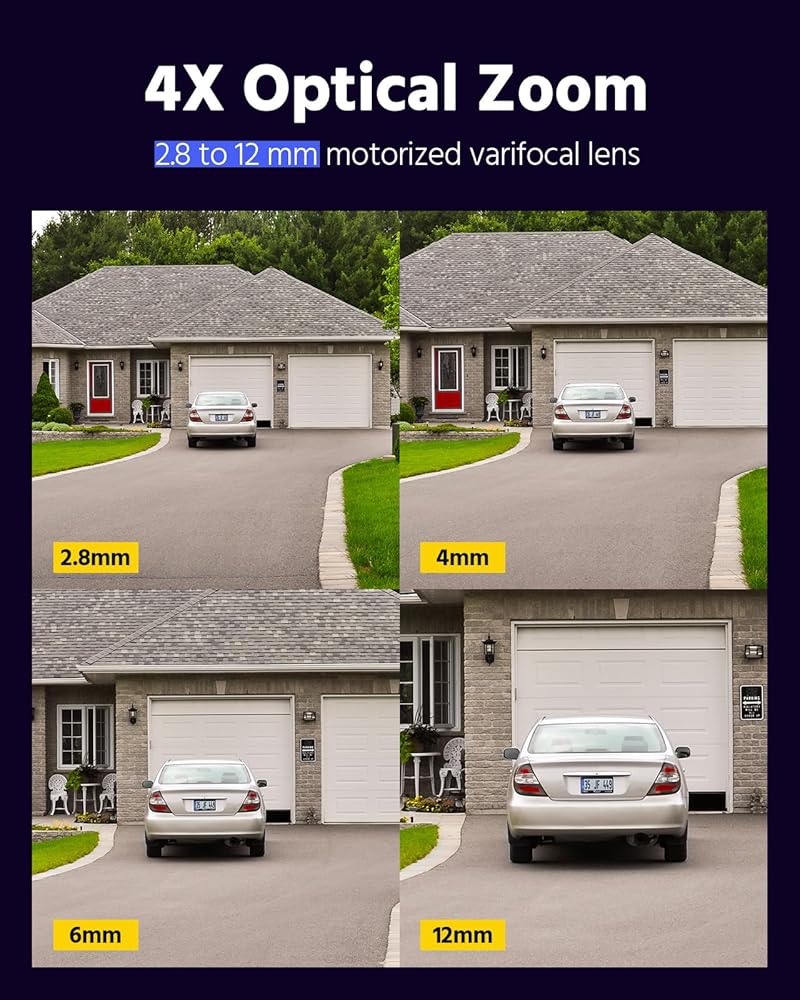 تفاصيل 4K فائقة الدقة وتكبير بصري 4X: تتميز كاميرا IP PoE هذه بدقة 3840*2160، وهي أكثر وضوحًا بمقدار 4X من 1080P وتكشف بشكل حاد عن المزيد من التفاصيل. مع التكبير البصري 4X، سيساعدك التكبير التلقائي للعدسة مقاس 2.8-12 مم على رؤية المزيد من التفاصيل عند التكبير. ويمكن عرض أي ميزات صغيرة لكائنات المراقبة الإضافية (الإنسان/المركبة) بوضوح على شاشة هاتفك الذكي.