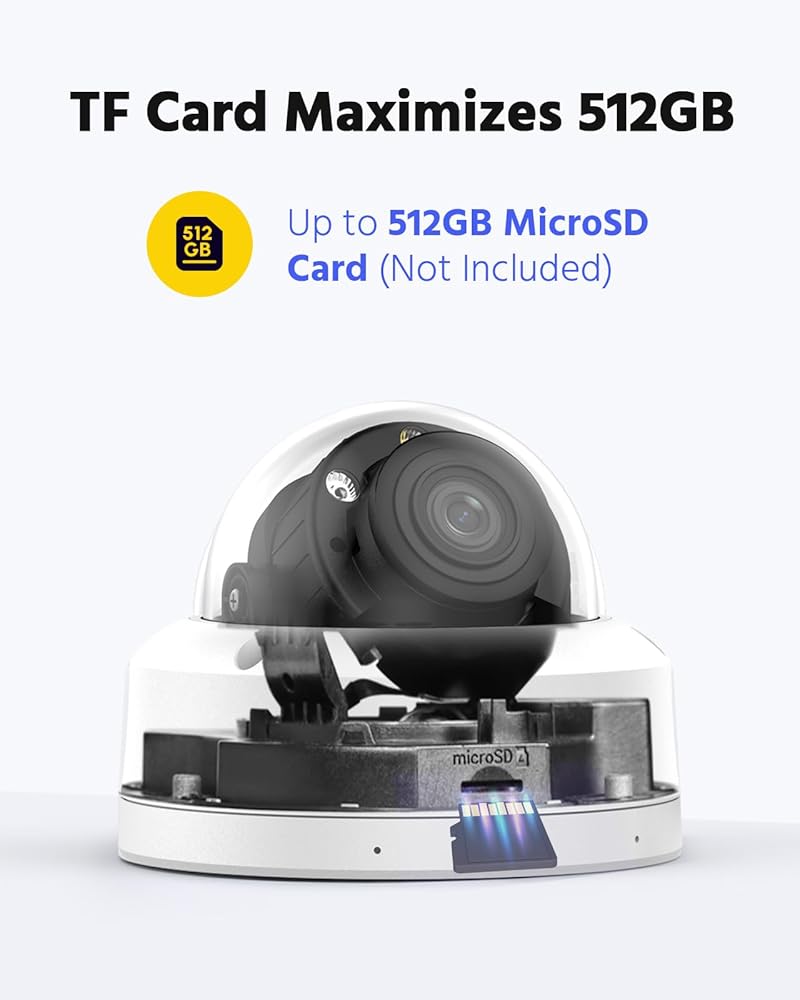 خيارات تسجيل متعددة: قم بتسجيل وحفظ مقاطع الفيديو محليًا عبر NVR أو عن طريق إدخال بطاقة TF/Micro SD بسعة تصل إلى 512 جيجابايت (غير متضمنة) في كاميرا PoE IP. يرجى ملاحظة أن هناك كابل شبكة اختبار واحد فقط بطول 1 متر في العبوة، لذلك تحتاج إلى شراء كابلات الشبكة والمحول بالإضافة إلى ذلك.