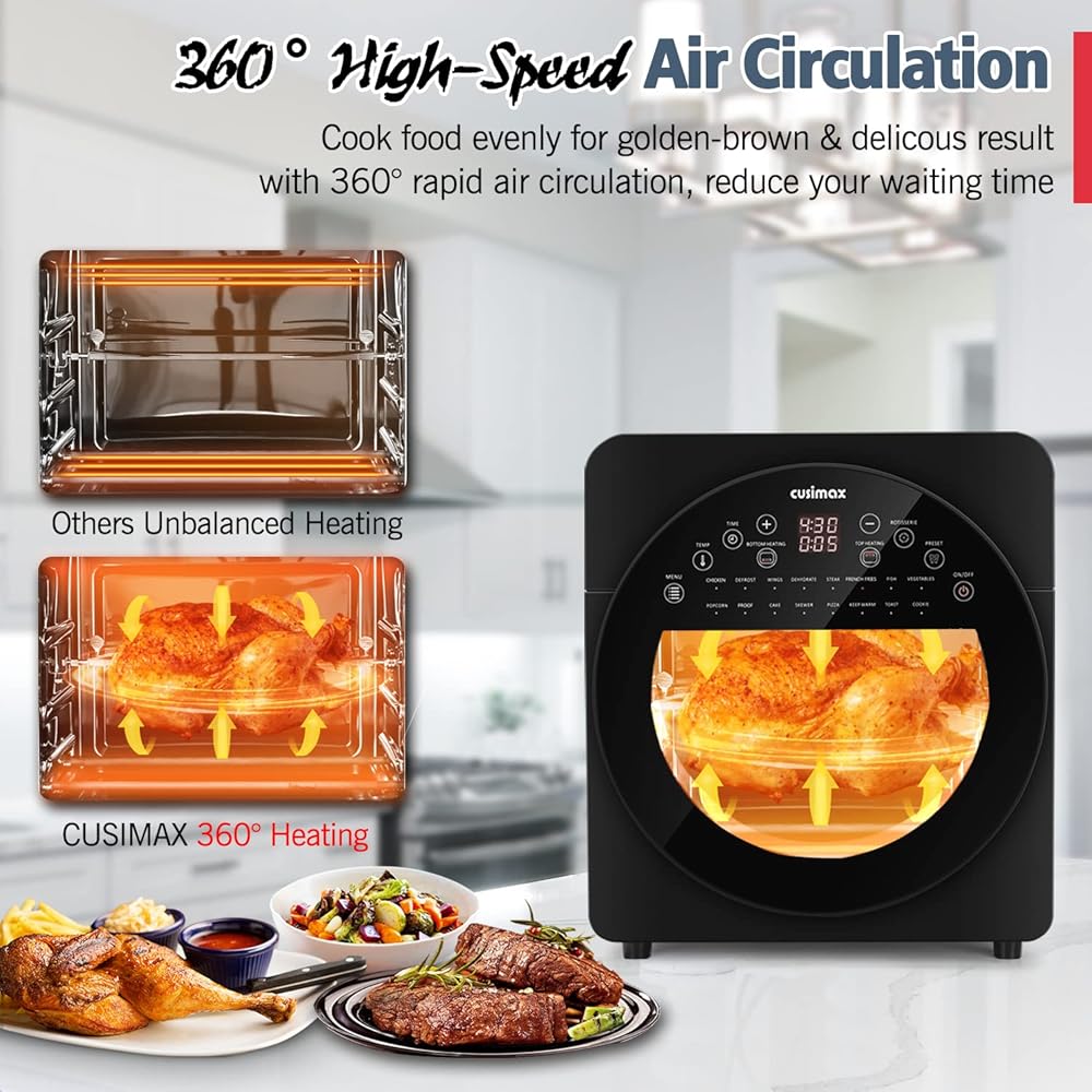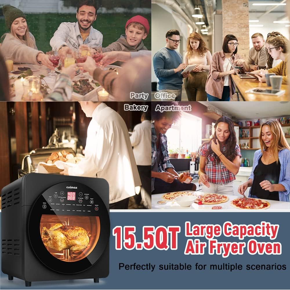 فرن محمصة مقلاة هوائية من كوسيماكس، مجموعة مقلاة هوائية بسعة 15.5 لتر، فرن محمصة مقلاة هوائية 16 في 1، مشواة حرارية كبيرة مع مشواة ومجفف، ملحقات غنية، أدوات تحكم رقمية، أسود