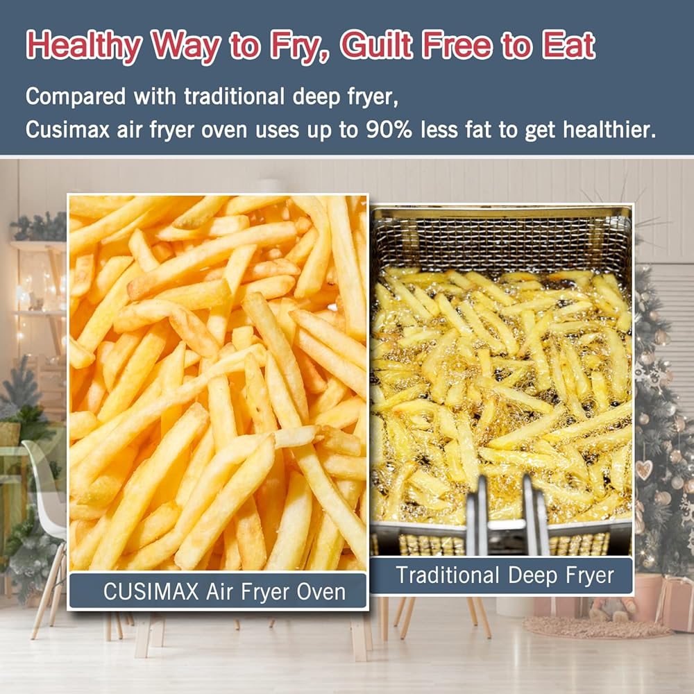 • [طهي صحي بدون زيت] - يستخدم الفرن الحراري للمقلاة الهوائية تسخينًا متوازنًا لأعلى ولأسفل وتسخين دوران الهواء الساخن 360 درجة للقلي والشواء وخبز الطعام. تعمل الدورة الدموية السريعة للهواء على طهي الطعام بشكل أسرع بنسبة 30% مع زيت أقل بنسبة 90% والحفاظ على رطوبة اللحم مع القليل من الزيت أو بدونه، مما يعدك بطعام صحي بالإضافة إلى المذاق اللذيذ.