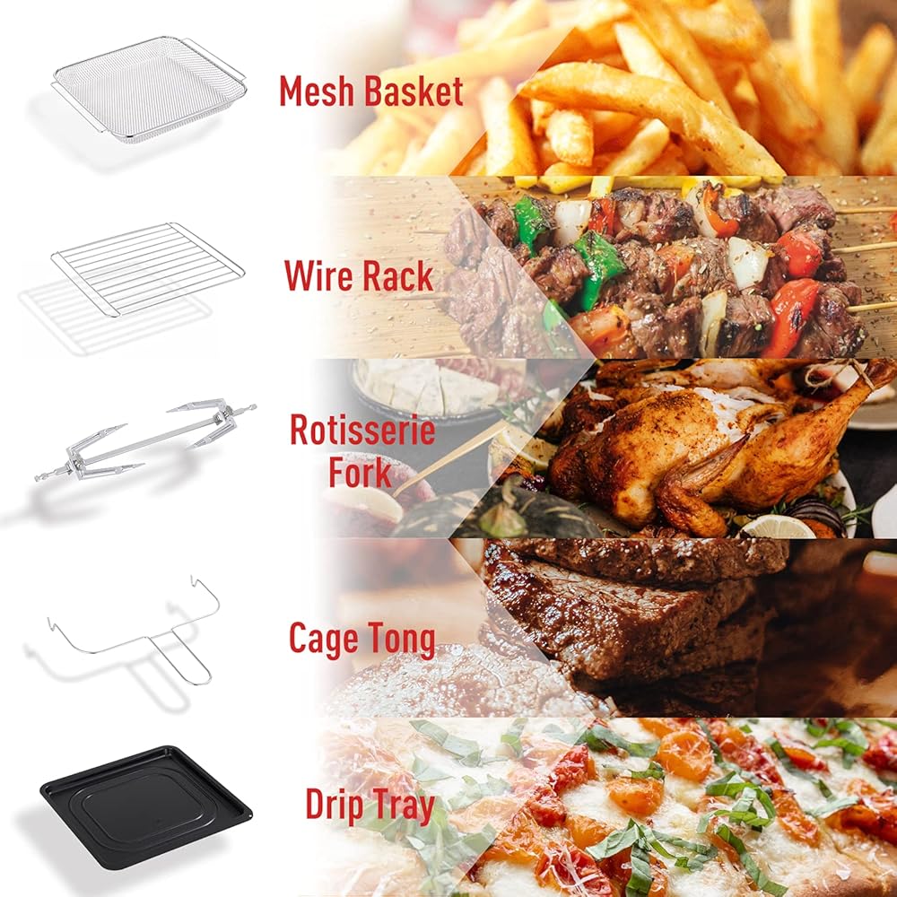 • [الملحقات + الضمان] - يأتي سطح فرن المحمصة مع 5 ملحقات، بما في ذلك سلة شبكية ورف سلكي وصينية تنقيط وشوكة مشواة وملقط قفص. جميع الملحقات قابلة للغسل في الأطباق. إذا كان لديك أي أسئلة حول هذا المنتج، يرجى الاتصال بفريق خدمة العملاء لدينا، وسوف نقوم بالرد عليك في غضون 24 ساعة.