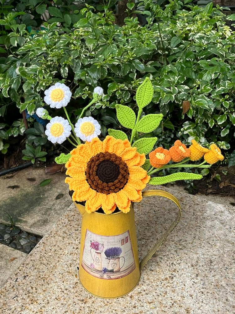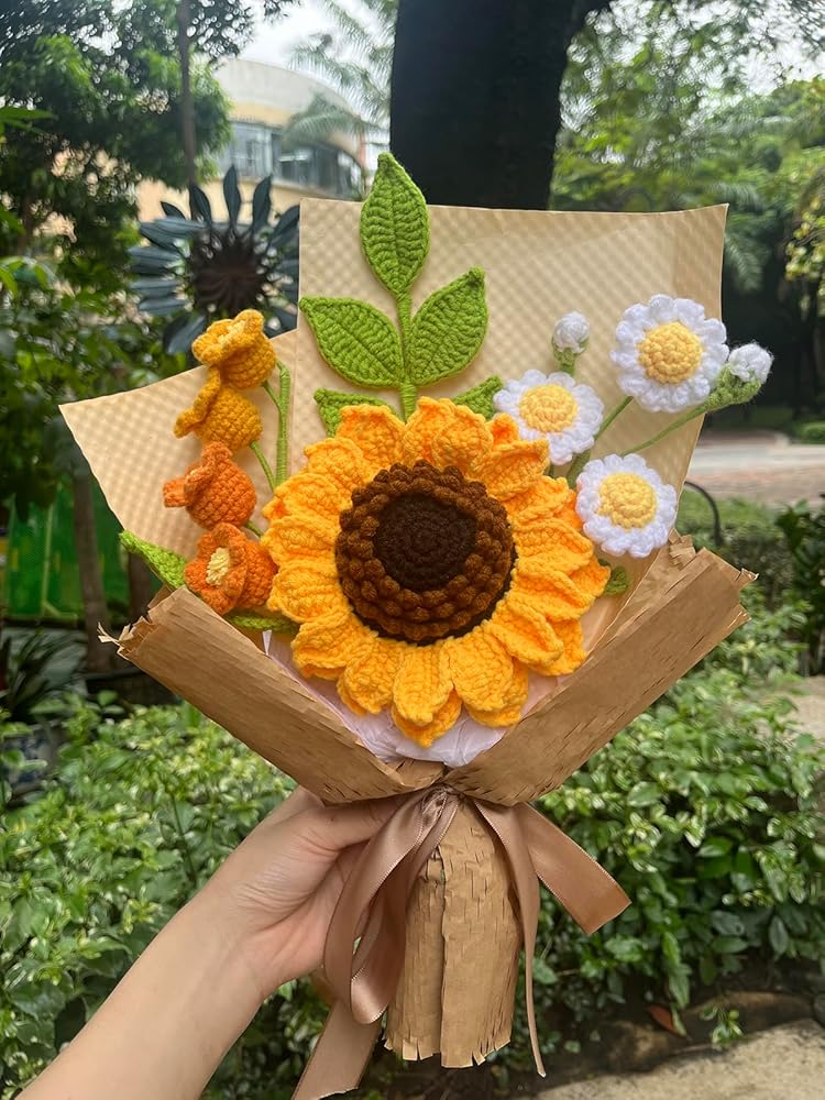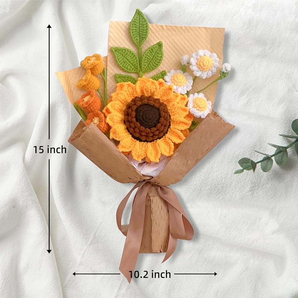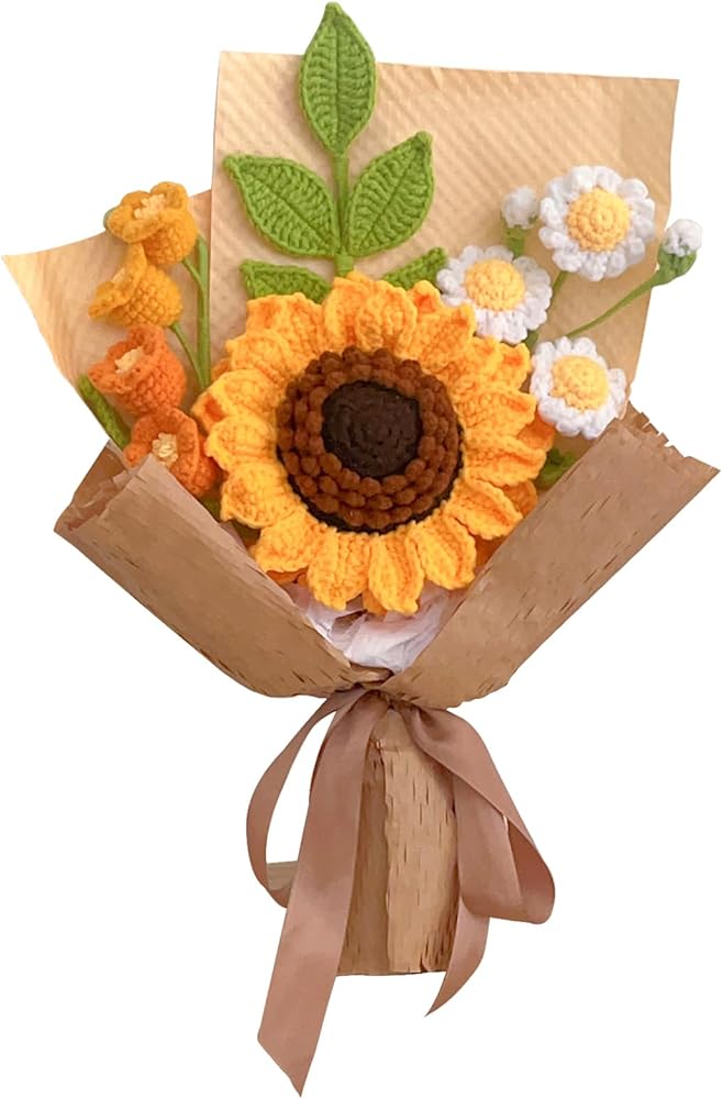 باقة رائعة مصنوعة يدوياً: تتميز هذه الباقة من الكروشيه بمجموعة مذهلة من الزهور بما في ذلك زهرة عباد الشمس الكبيرة مزدوجة الطبقات، وزهرة الأقحوان متعددة الرؤوس (مع 3 أزهار أقحوان بيضاء)، وزهرة جريس متدرجة الألوان (تتكون من 4 أزهار صغيرة)، وغصن من زهور الأقحوان. أوراق دائمة الخضرة.