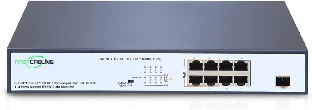 محول FASTCABLING 8 منافذ 2.5G PoE++ مع وصلة 10G Uplink، 8×100/1000M/2.5G RJ45 Ports، 90W/30W High Power PoE، 240W، 10G SFP+ Uplink، التوصيل والتشغيل، سطح المكتب/التثبيت على الحائط