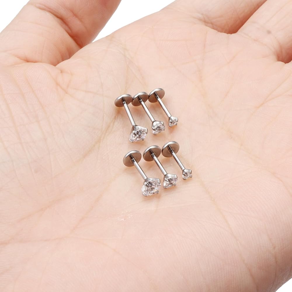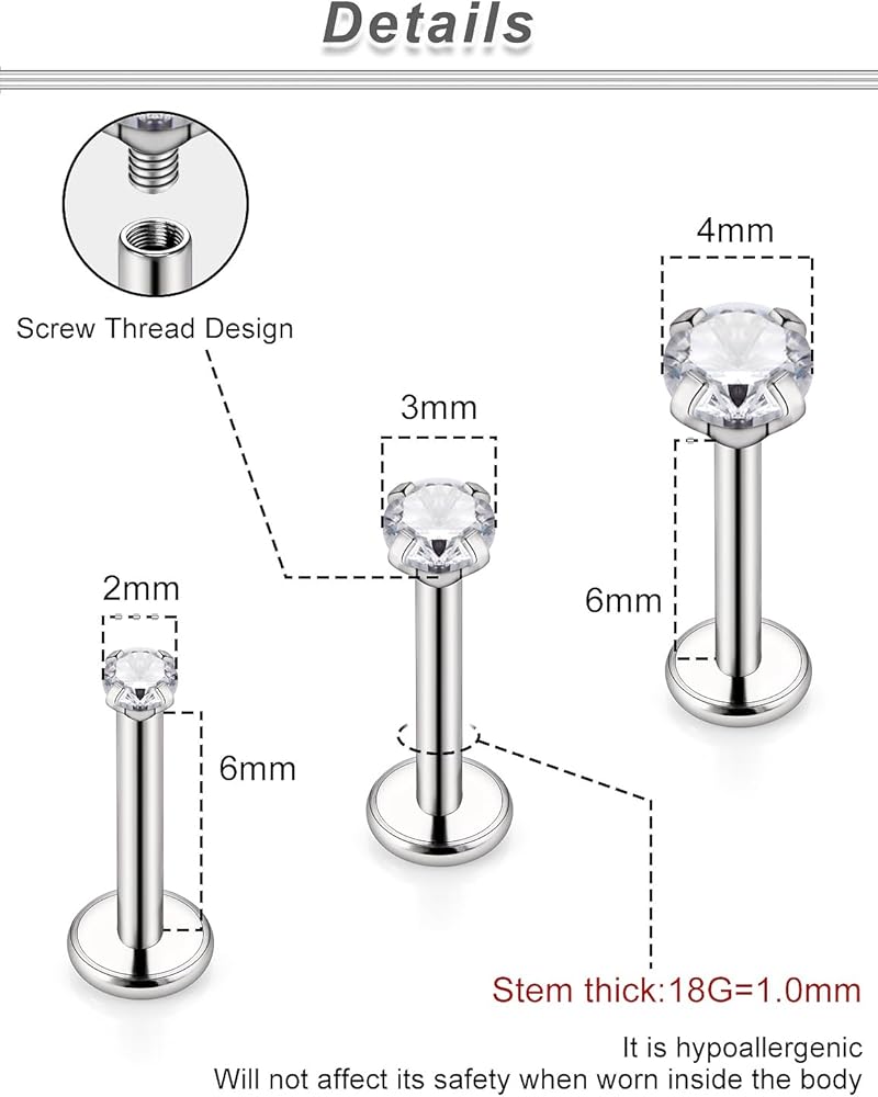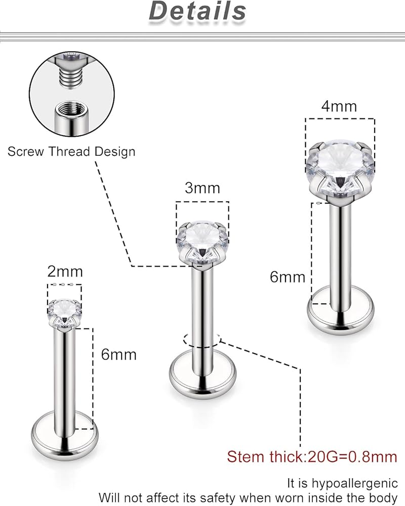 حجم أقراط مسمار الأنف المسطحة من التيتانيوم - حجم المقياس: 20 جم (0.8 مم) ثقب مسمار الأنف، طول القضيب: 6 مم، قطر الحجم العلوي: 2 مم 3 مم 4 مم. الحجم العام للارتداء، يناسب كل من الرجال والنساء.