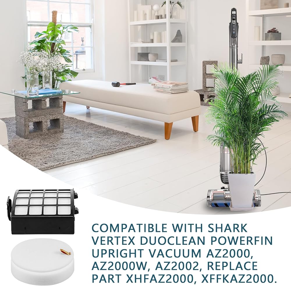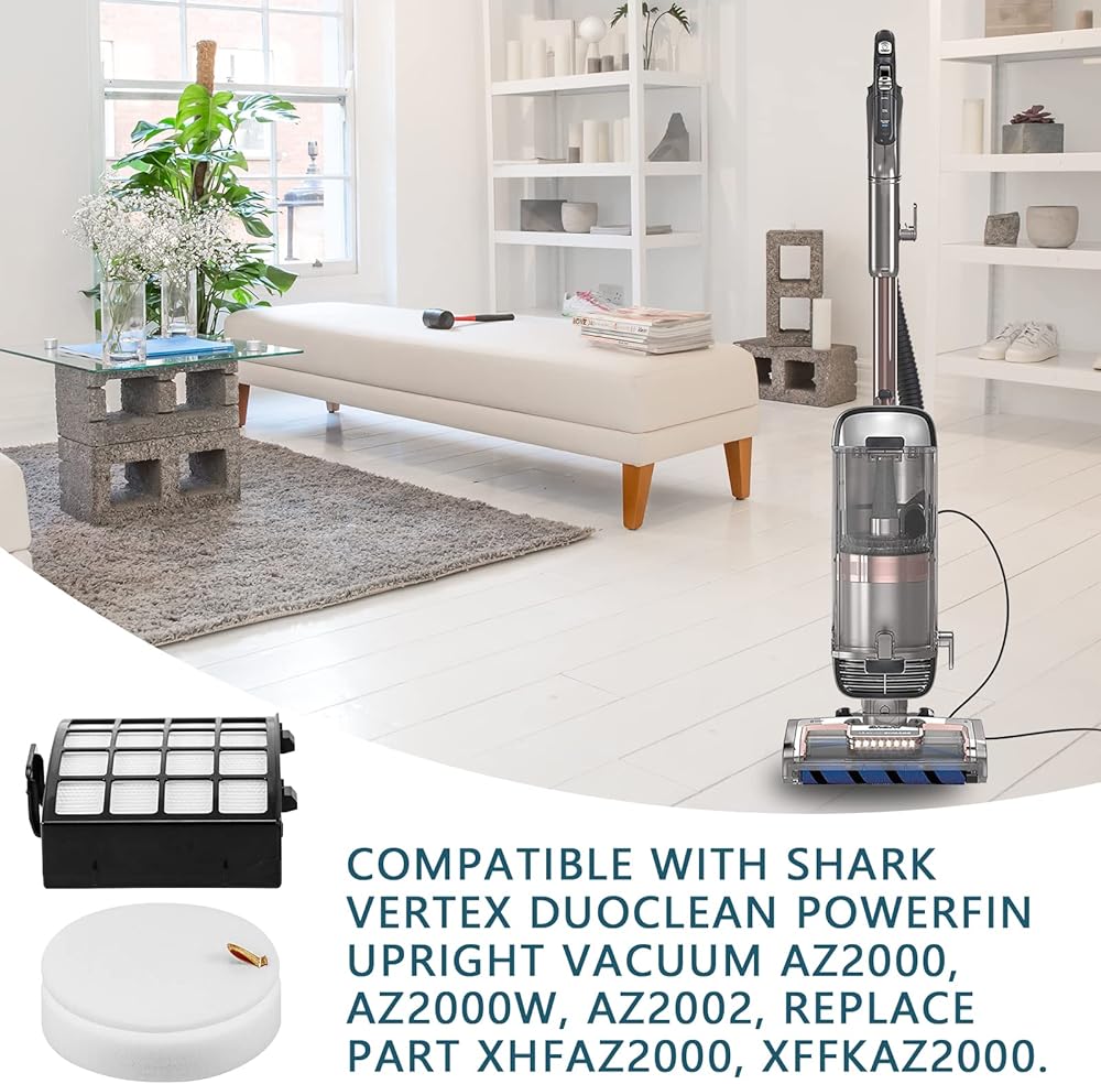بدائل الفلتر لمكنسة Shark Vertex DuoClean PowerFin المستقيمة AZ2000، AZ2000W، AZ2002، تستبدل XHFAZ2000، XFFKAZ2000، 2 HEPA + 4 مرشحات إسفنجية ولباد + فرشاة تنظيف واحدة