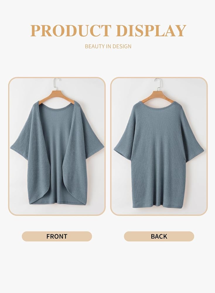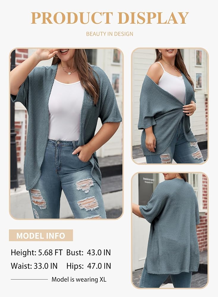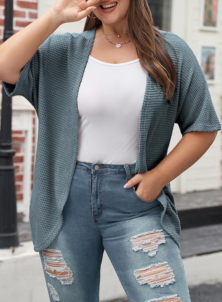سترة Eytino النسائية بمقاس كبير مفتوحة من الأمام كيمونو كارديجان بأكمام قصيرة صيفية منسوجة بلوزات خفيفة الوزن وخفيفة الوزن كبيرة الحجم ملابس خارجية زرقاء ضبابية 3X