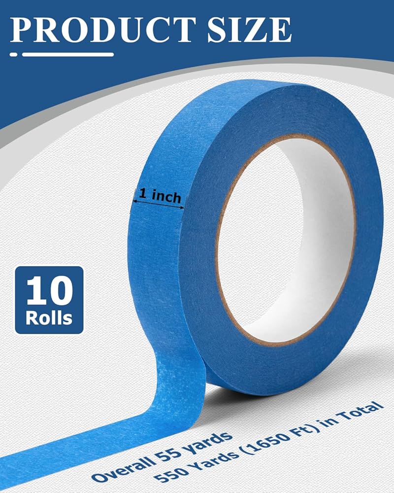 Blue Painters Tape: Our Package includes 10 rolls of blue masking tape, the quantity can meet most of your daily needs. The blue painters tape is general purpose and each roll is 1 inch x 55 yards (2.5 cm x 50 m)