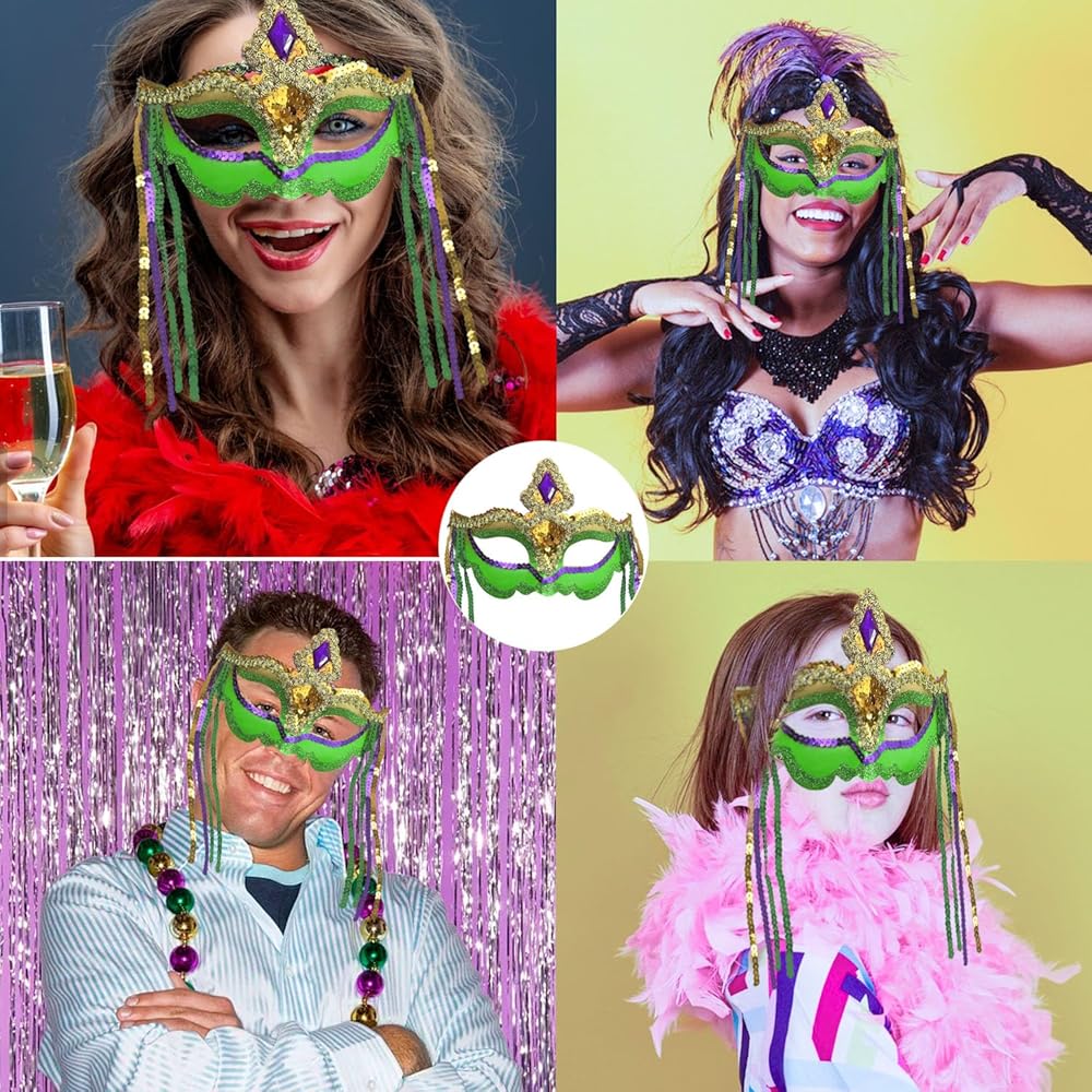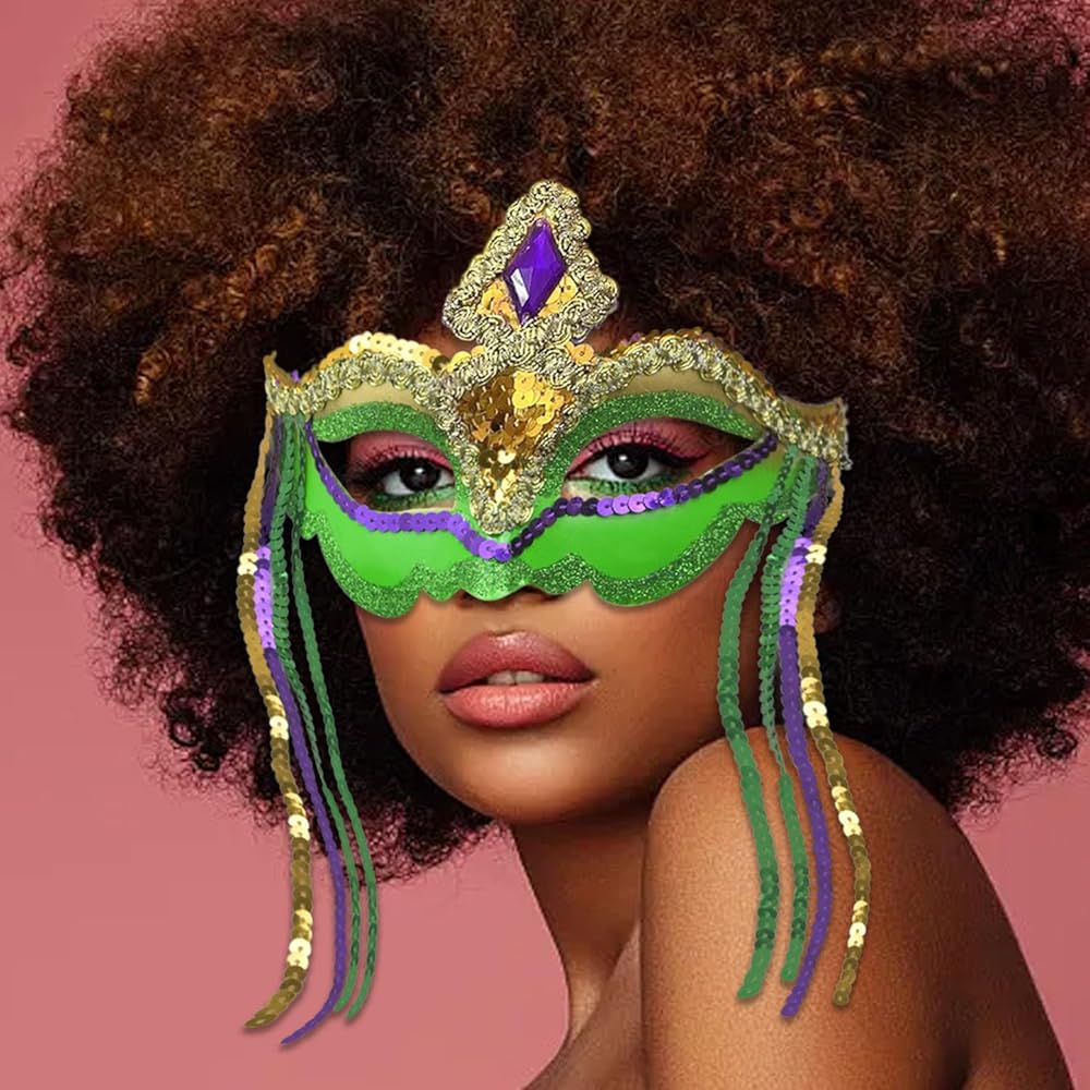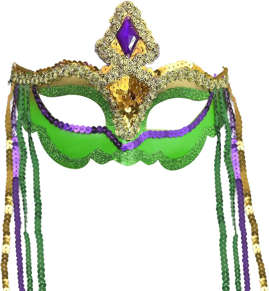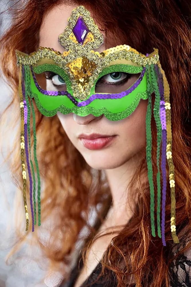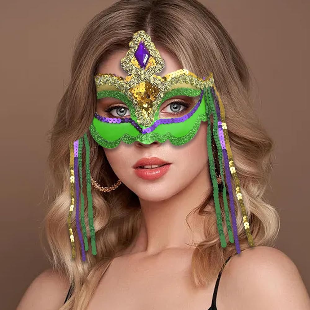 MASQUERADE MASK DESIGN - Base of the mardi gras face mask has ombre yellow to green coloring and the sequin detailing is finished off with a purple gem. The tassels on both sides of the cheeks make the mask more special. Wearing masquerade mask for girls can make your face look delicate and beautiful.