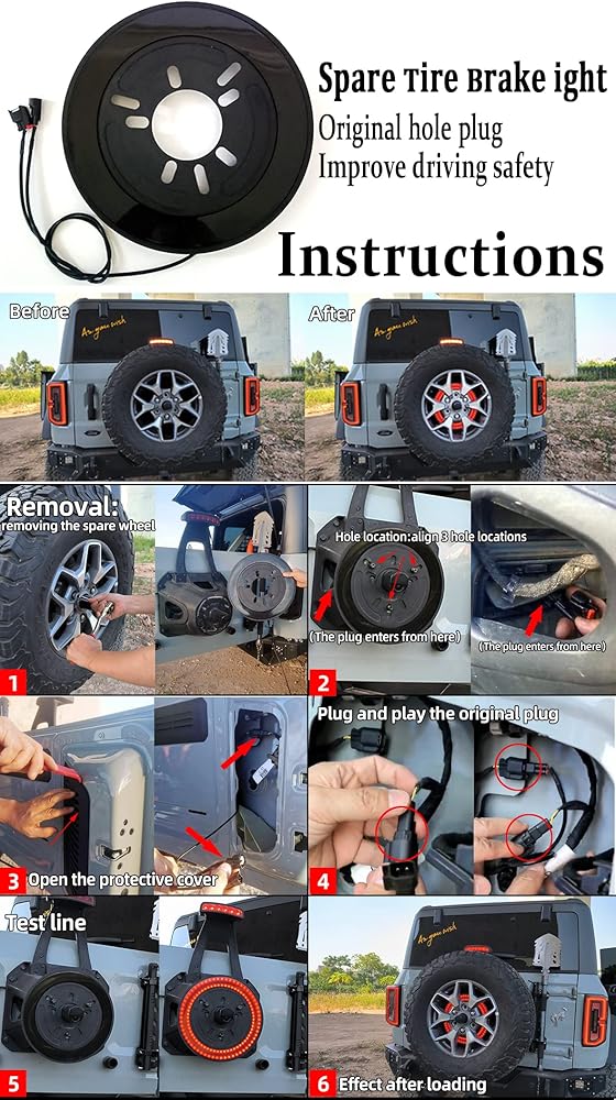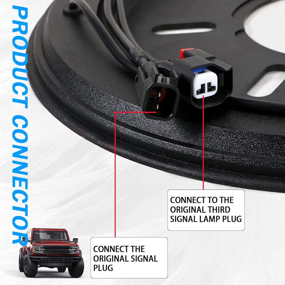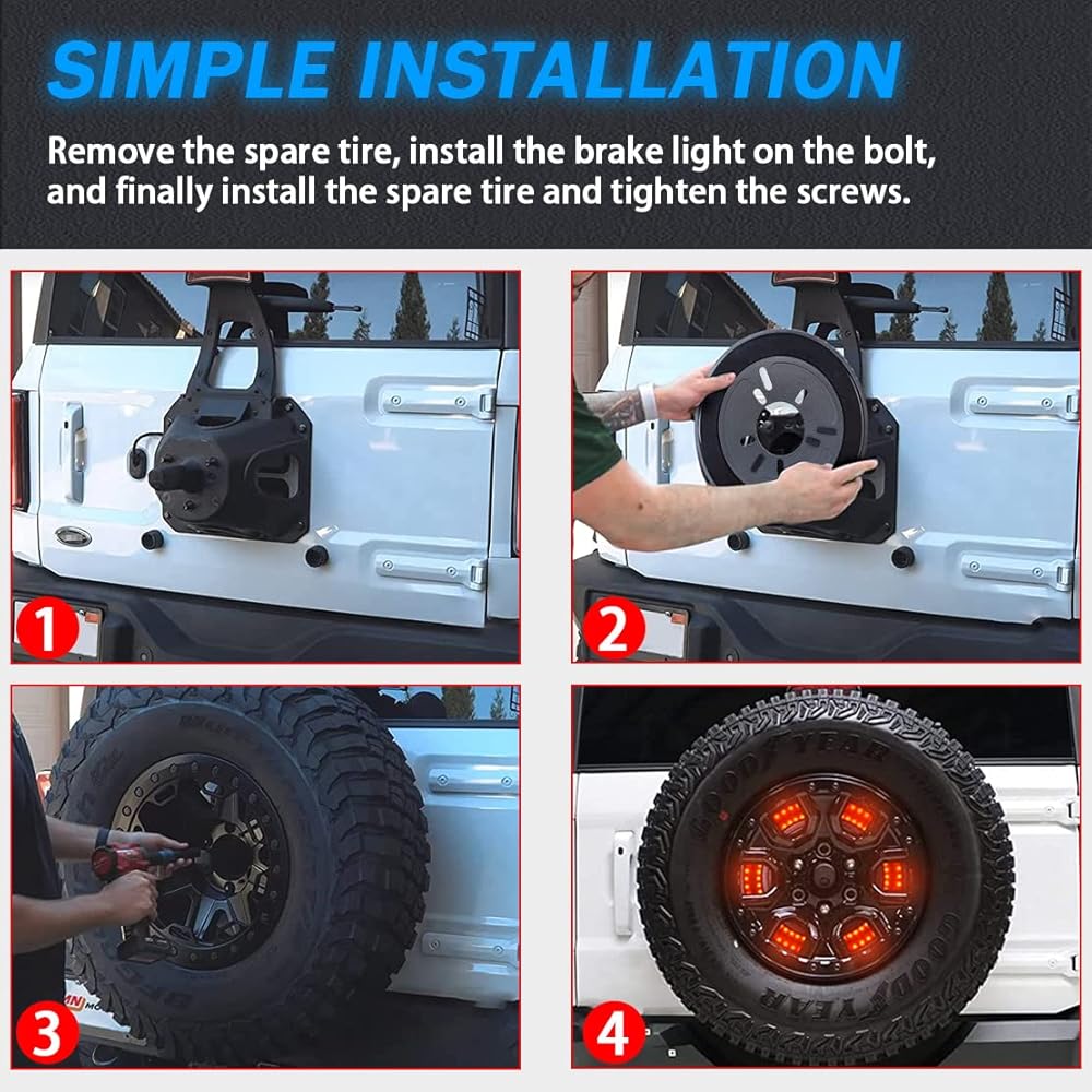 [التوصيل والتشغيل] من أجل توصيل وتشغيل ضوء الإطار الاحتياطي من برونكو، سهل التركيب، فقط قم بتوصيل ضوء الفرامل عالي التحمل على الباب الخلفي، يمكن توصيل محول ضوء الإطار الاحتياطي في سلسلة مع ضوء الفرامل عالي الخليج.