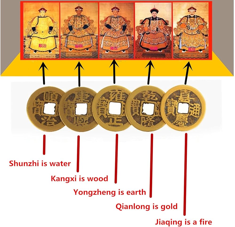 【Meaningful Theme】Chinese knot lucky coins include 5 imitation Ching-Dynasty-style coins printed clear names of emperors, Qianlong, Yongzheng, Jiaqing, Shunzhi and Kangxi, people believe that can attract good luck and enhance positive Chi for health and wealth when hang them.