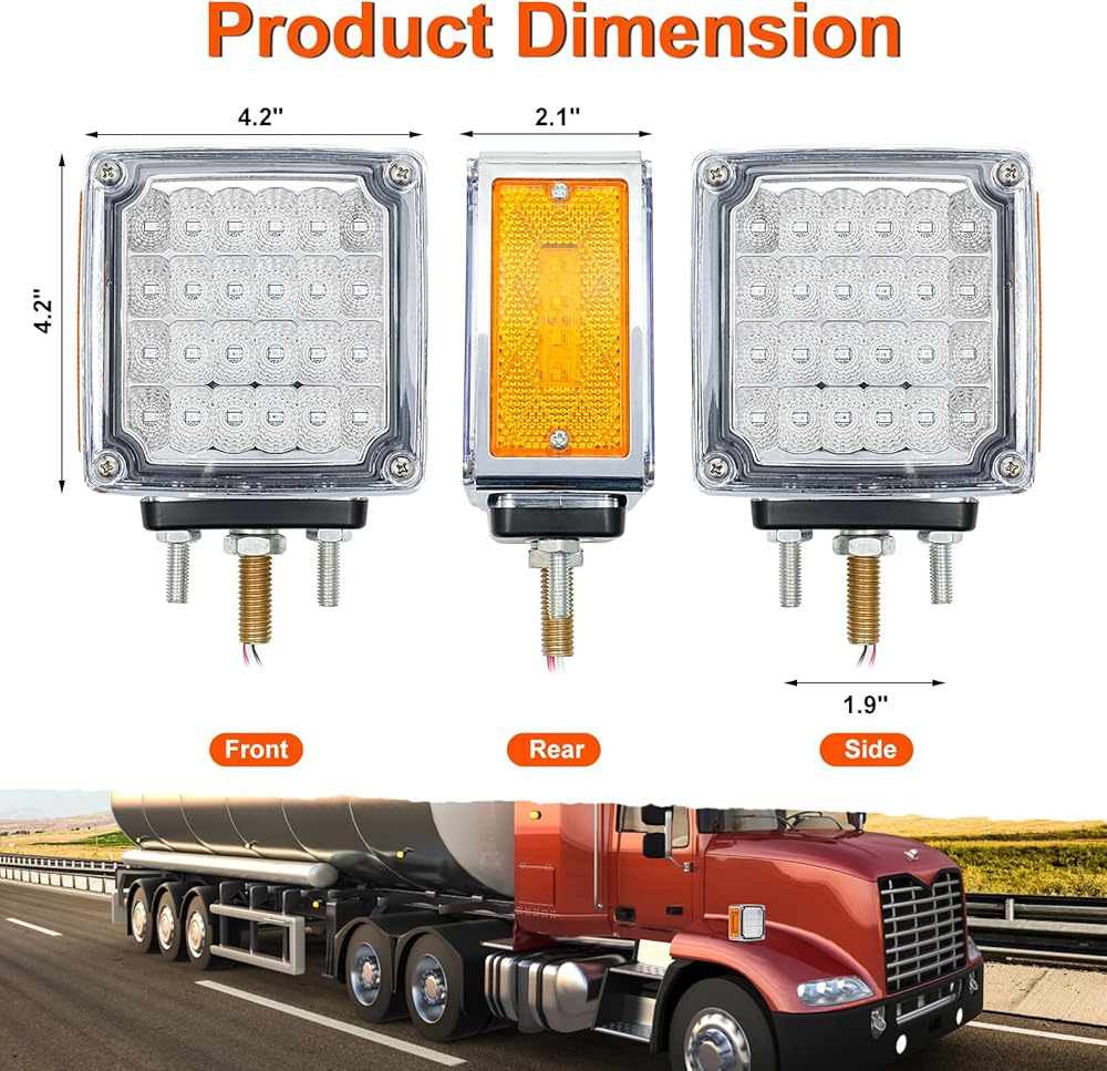 يحتوي مصباح Fender Pedestal Light على إجمالي 60 مصباح LED (24 قطعة على الجانبين الأمامي والخلفي، و12 قطعة على الجانب)؛ وتتميز مصابيح إشارة الانعطاف LED هذه بإضاءة كهرمانية وحمراء في العدسة الواضحة. 60 مصباح LED إجمالي و12 مصباح LED للعلامة الجانبية الكهرمانية، وتعد مصابيح إشارة الانعطاف ذات القاعدة المربعة ذات الوجه المزدوج خيارًا شائعًا للعديد من مصدات الشاحنات؛