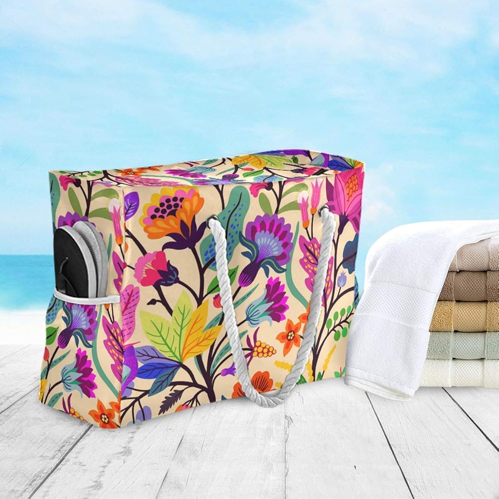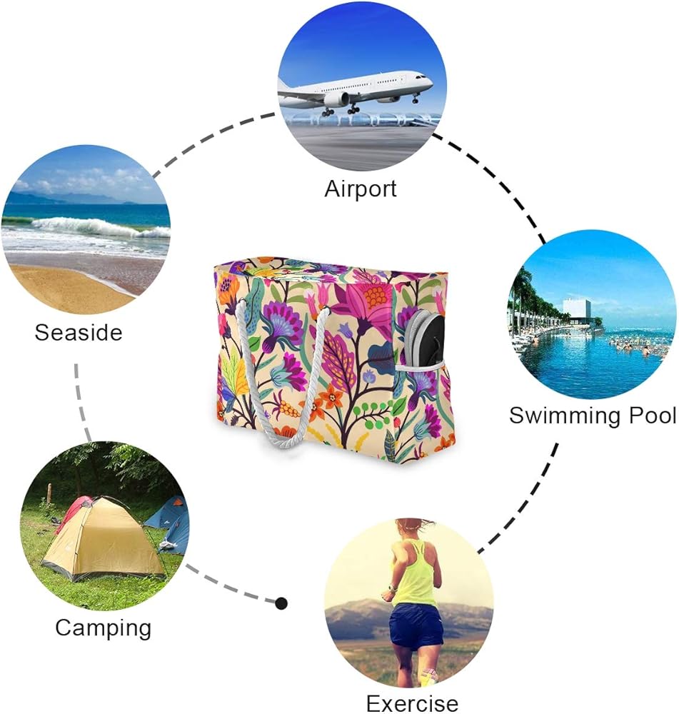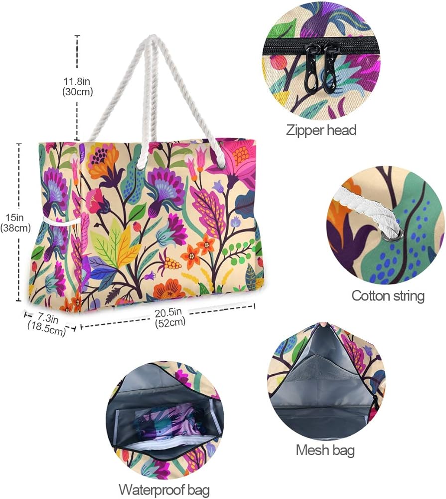 Feature: A roomy main compartment,the bag have a zippered top to keep all your belongings safe. PVC inner pocket can fit your cellphone, keys. There are 2 mesh pockets inside can keep your items separated and organized. 2 pockets on side to hold your water bottles, slippers, sun screen or sun glasses.
