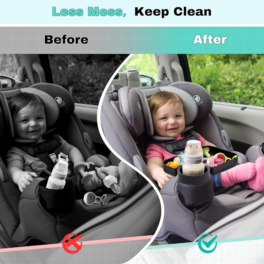 أيدي مجانية للآباء: يمكن لصينية حامل الأكواب في مقعد السيارة أن تحرر أيدي الآباء تمامًا أثناء عملية القيادة، ويمكن وضع المشروبات والوجبات الخفيفة بإحكام، مما يقلل من الحطام والسوائل المنسكبة في السيارة!