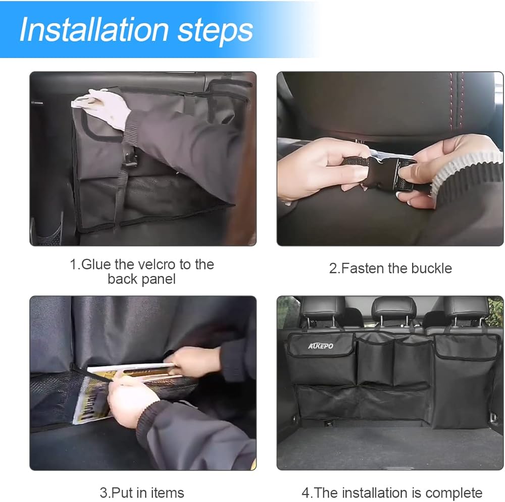 [تركيب سهل] ببساطة قم بتركيبه وإزالته في ثوانٍ، كل ما تحتاجه هو 4 خطوات، قم بتعليق منظم صندوق السيارة هذا على مسند الرأس باستخدام أشرطة إبزيم قابلة للتعديل، ثم قم بتوصيل الفتحة بالظهر وتأكد من بقائه ثابتًا لمنع السقوط. خطوات التثبيت موضحة في الصورة عند عدم الاستخدام، يمكنك طيها بحيث لا تأخذ سوى مساحة صغيرة للتخزين.