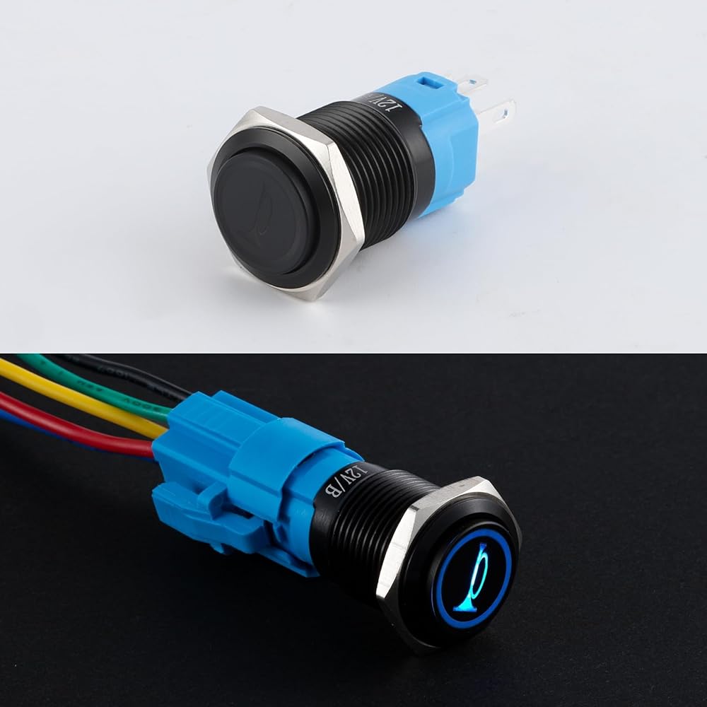 مفتاح زر ضغط لحظي من سينجارو 12 فولت، مفتاح طاقة مستدير مقاوم للماء من المعدن الأسود 16 مم مع ضوء LED لتعديل السيارة والشاحنة والقوارب البحرية (أزرق)