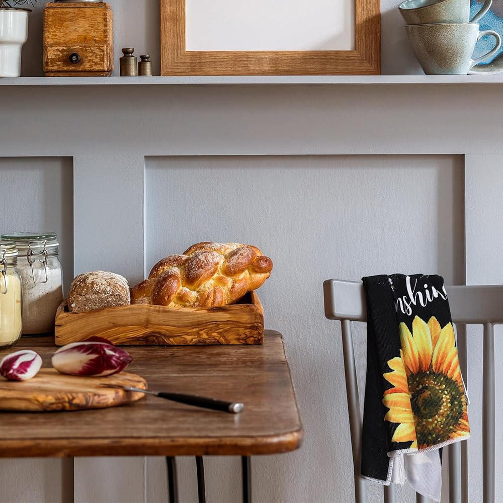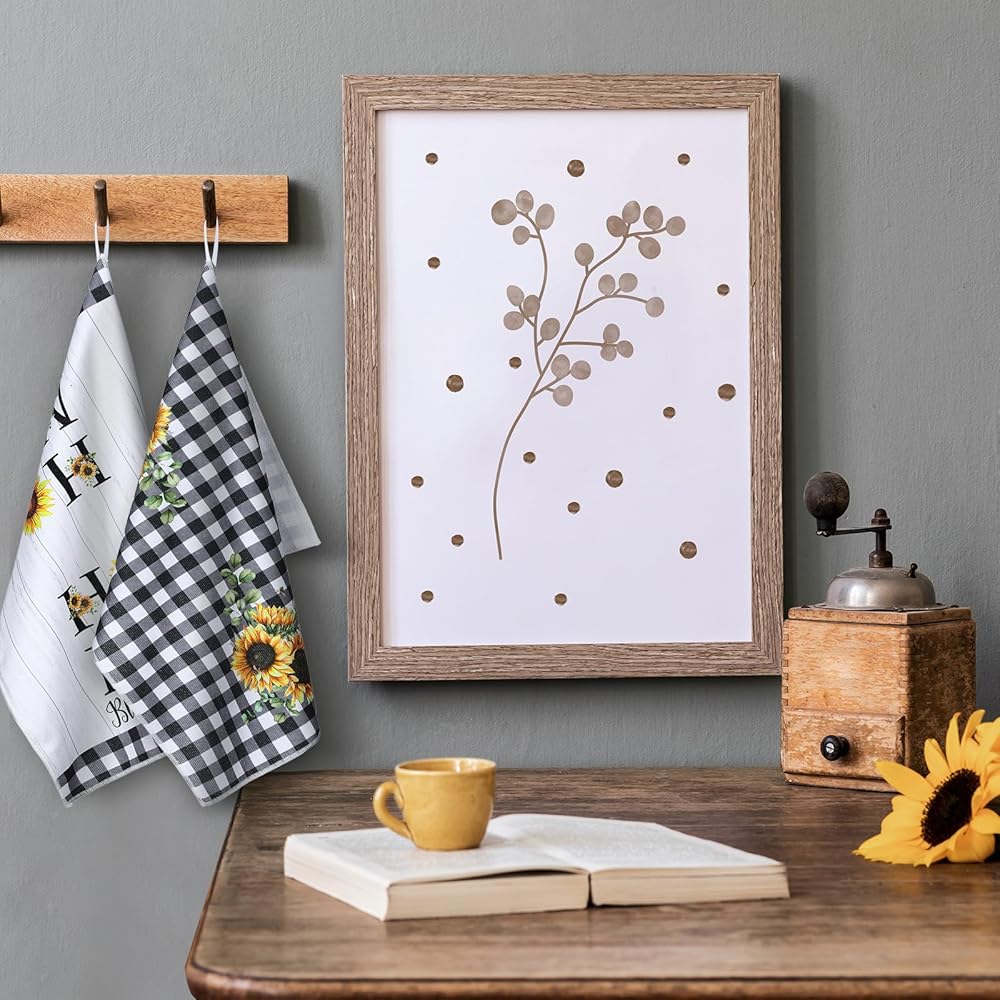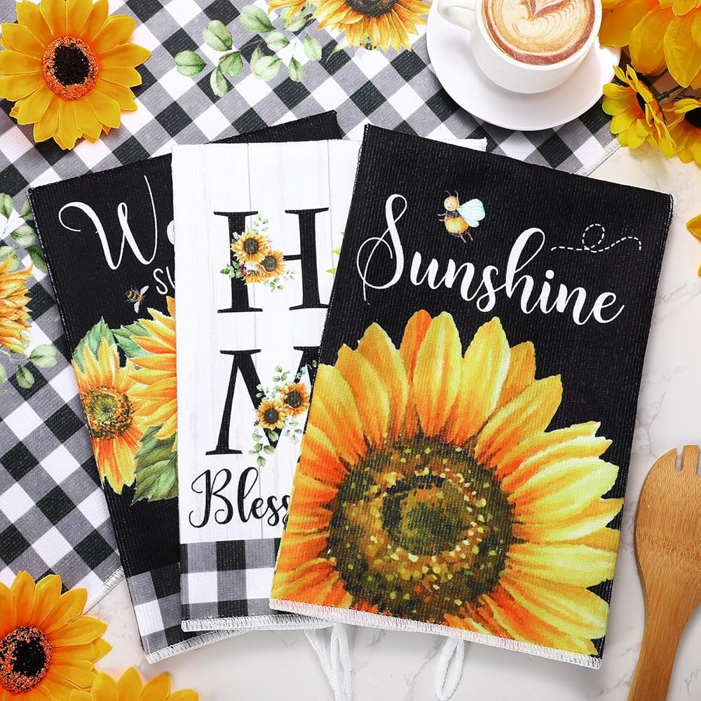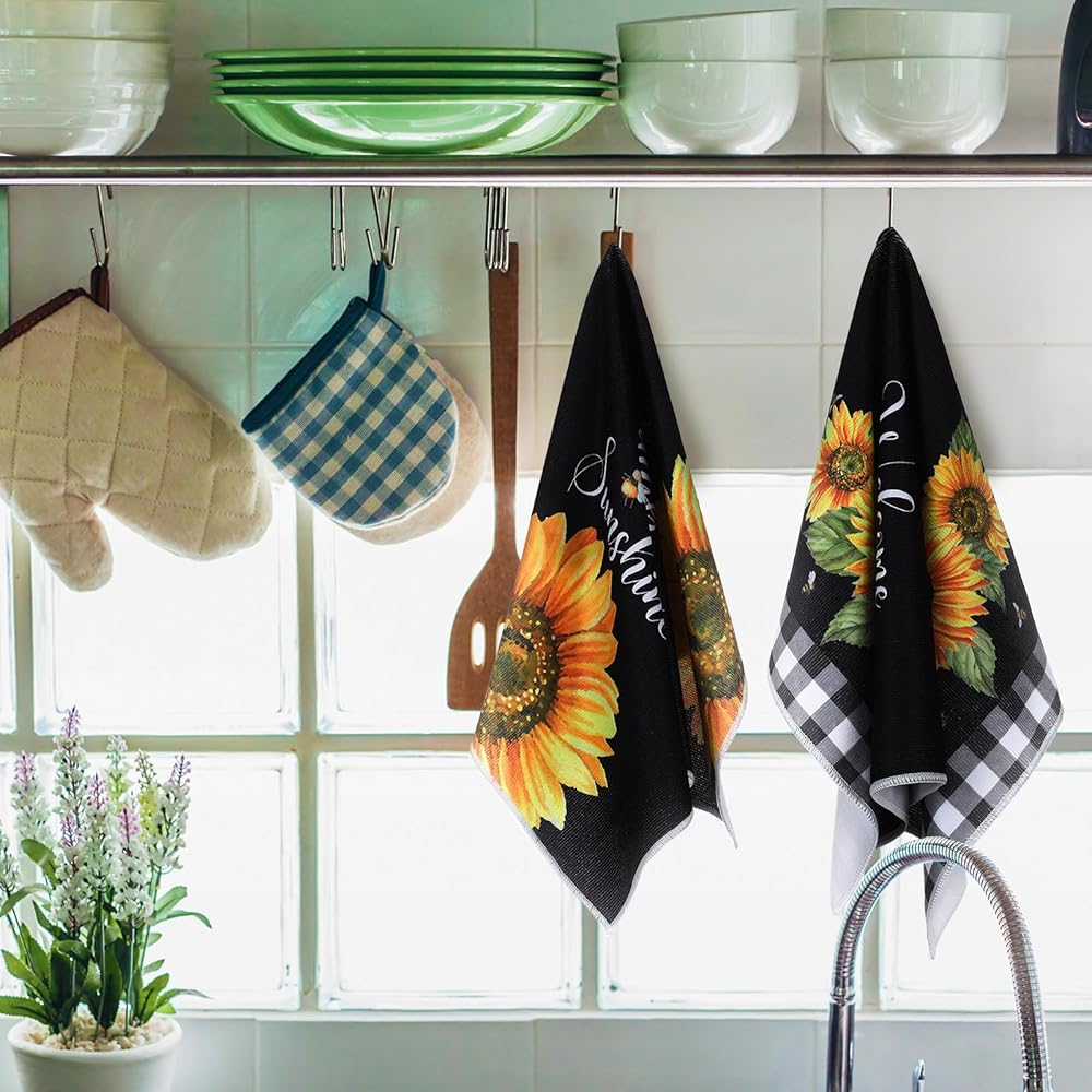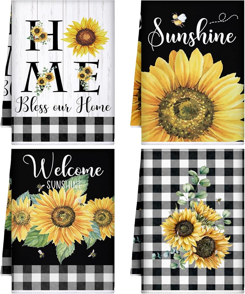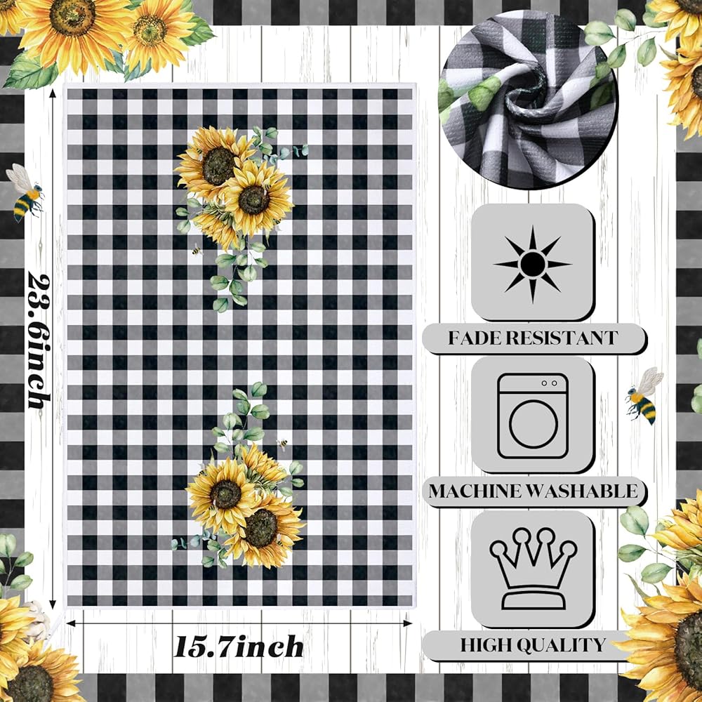 تصميم بطابع عباد الشمس: تم تصميم مجموعة مناشف المطبخ مع موضوع عباد الشمس، ومطبوعة بأنماط عباد الشمس، والقضم، والشاحنة، والشيكات، والحذاء، والمزهرية وأكثر من ذلك، رقيقة ورائعة، والأصفر والأبيض والبني والأخضر الرئيسي الألوان تخلق جوًا دافئًا ومبهجًا