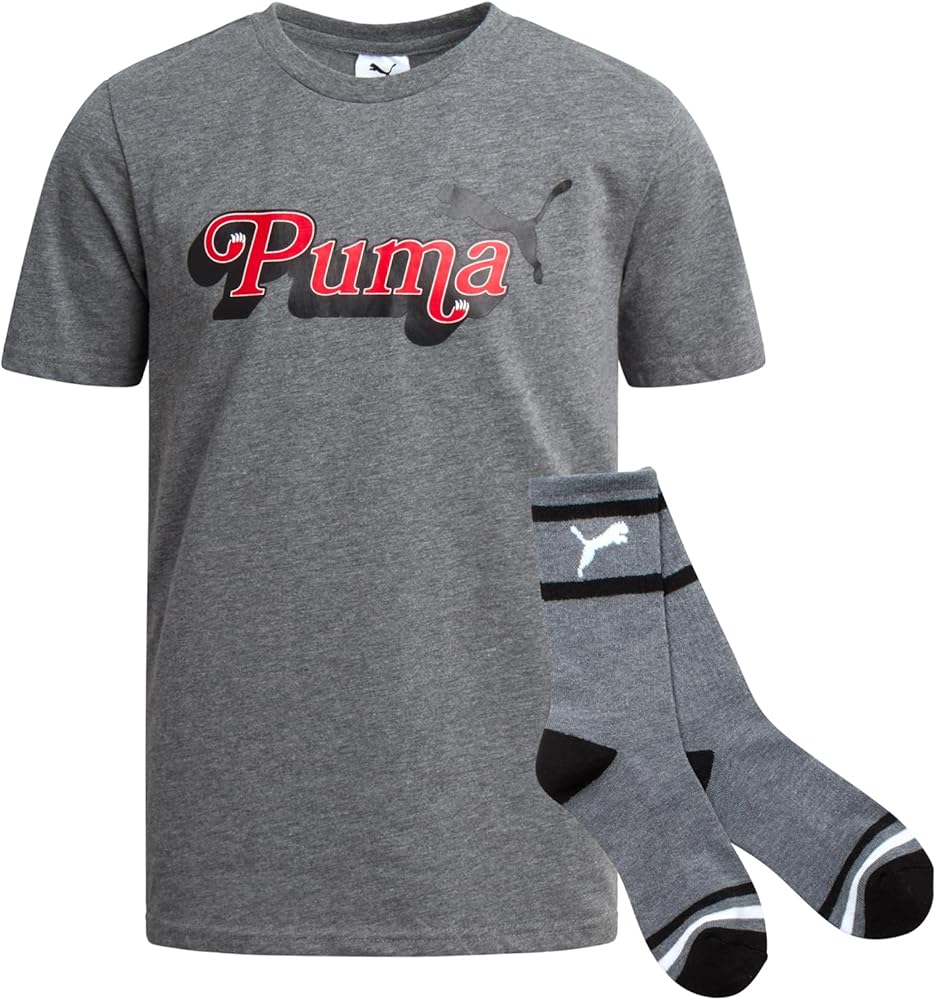 بوما مرخصة رسميًا: طقم تي شيرت وجوارب متطابقين للأولاد؛ مستوحاة من القيم التي تجعل الرياضي ممتازًا: كن شجاعًا، وواثقًا، وكن مصممًا، وكن سعيدًا، وكن بوما