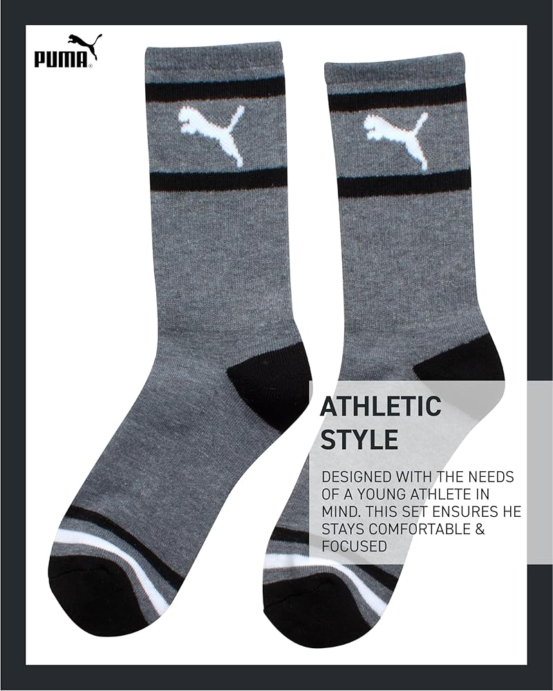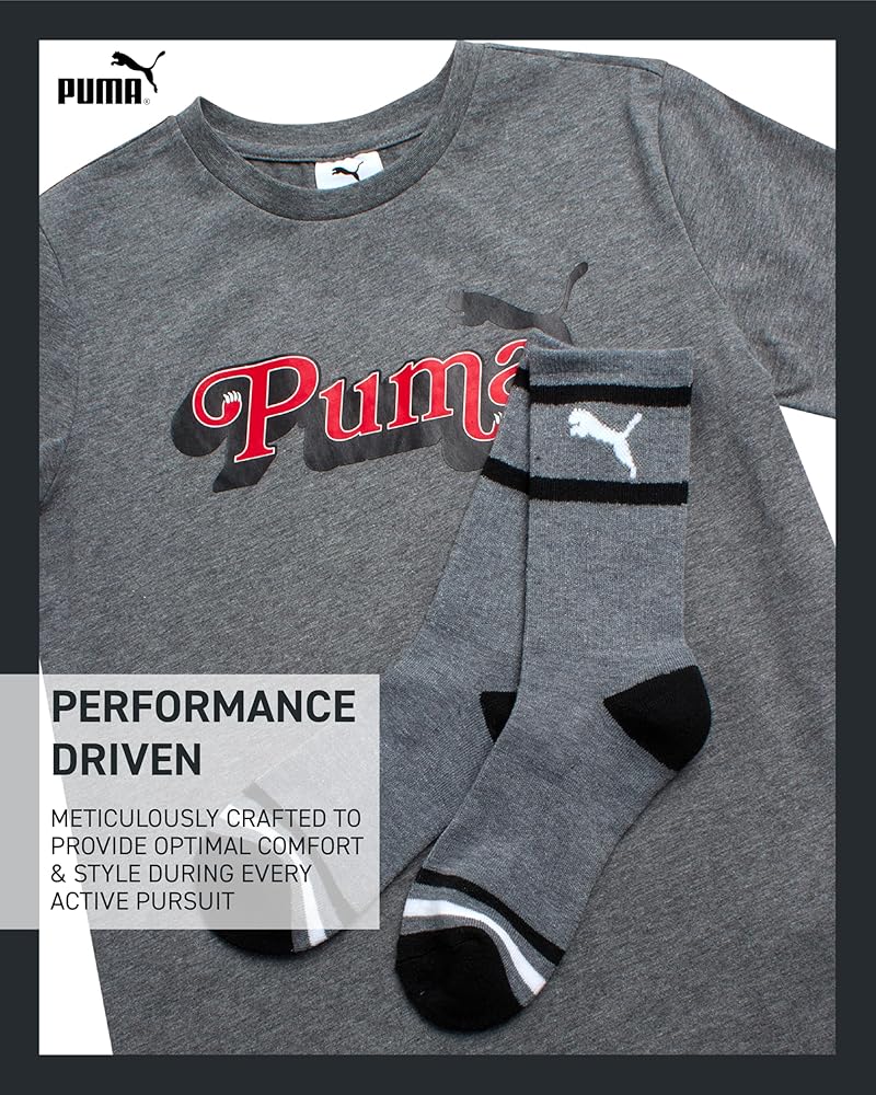 تصميم عالي الجودة: مصنوع بالجودة والمتانة التي تشتهر بها PUMA، يضمن طقم تي شيرت وجوارب دائرية للأولاد ارتداء وأداء يدوم طويلاً. يتميز التي شيرت بمقاس مريح ورسومات نابضة بالحياة، بينما توفر الجوارب الدائرية شعورًا مريحًا وداعمًا. دعه يظهر روحه الرياضية مع هذا الطقم الرائع من بوما