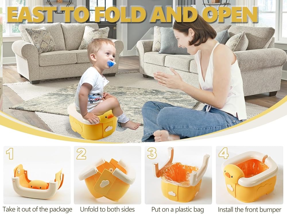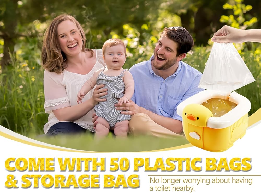 [👧 Portable Baby Potty 👧] The adorable duck-shaped portable baby potty features a foldable structure and comes with transparent garbage bags and a carrying bag, making it very convenient for travel. Whether in the car, on the lawn, at the beach, or indoors, this baby potty provides a sanitary solution for urgent toilet needs. Its compact design allows it to be easily placed in the trunk or a handbag, making it an essential accessory for family trip.