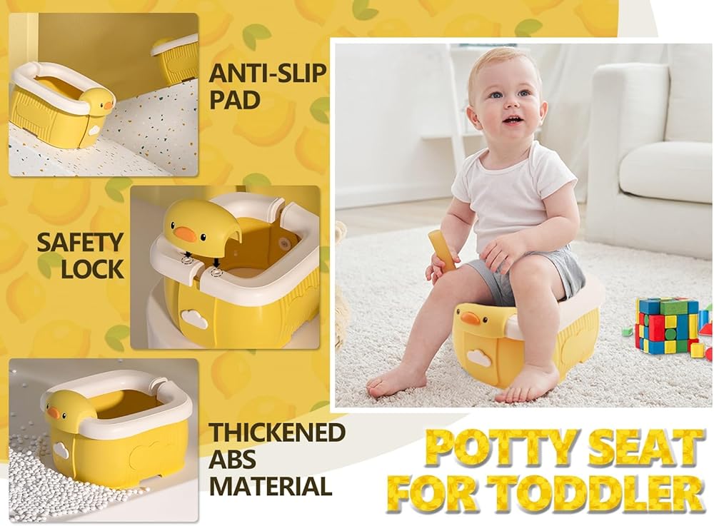 [👶 Toilet Training Aid 👶] This baby potty, with its cute duck shape, has captured the hearts of little babies, encouraging them to use it for their bathroom needs. The bottom of the potty is equipped with four upgraded non-slip strips that effectively prevent the potty from slipping, making the transition from diapers to using a potty smooth and safe for children. It is an ideal tool for parents to support their children's growth and promote self-reliance.