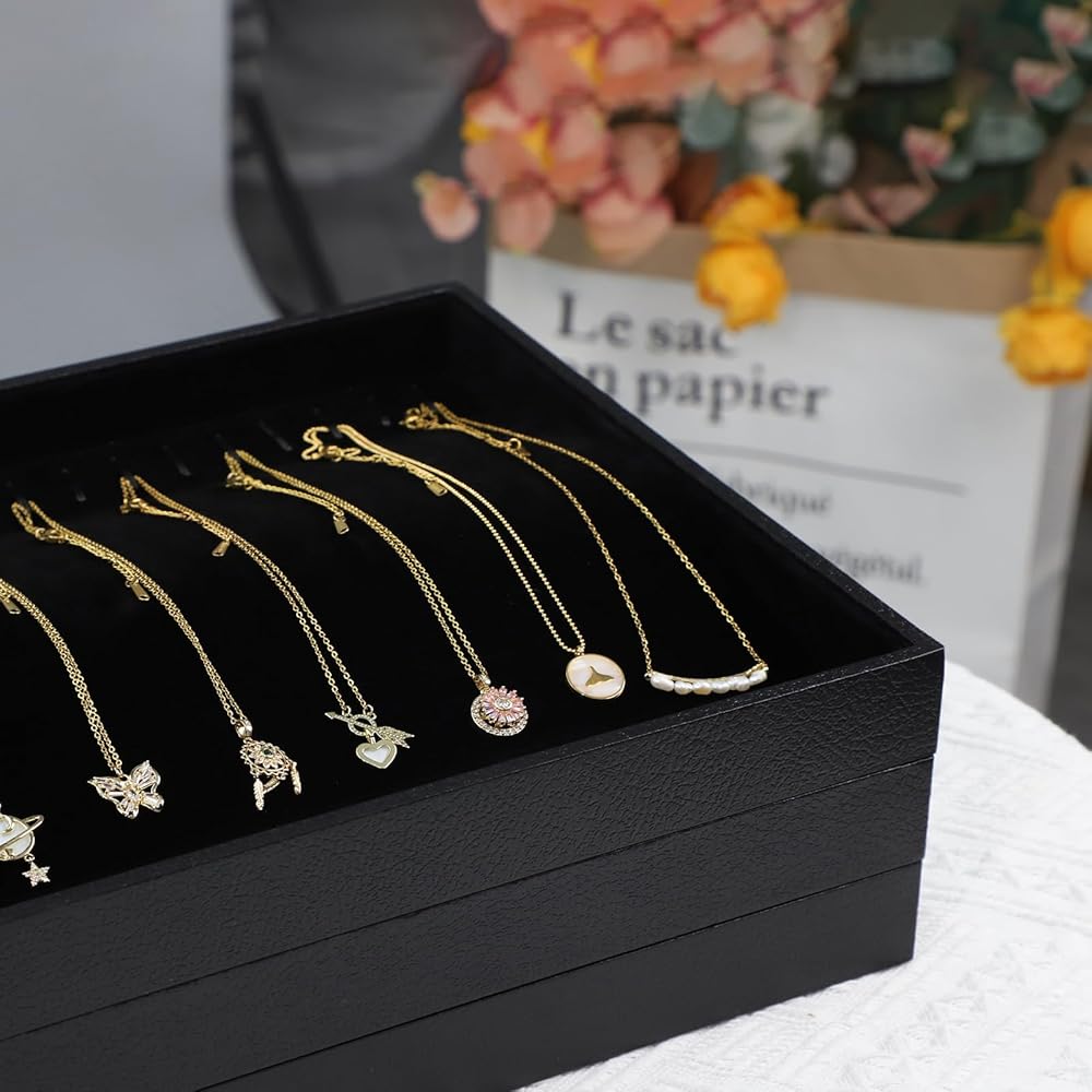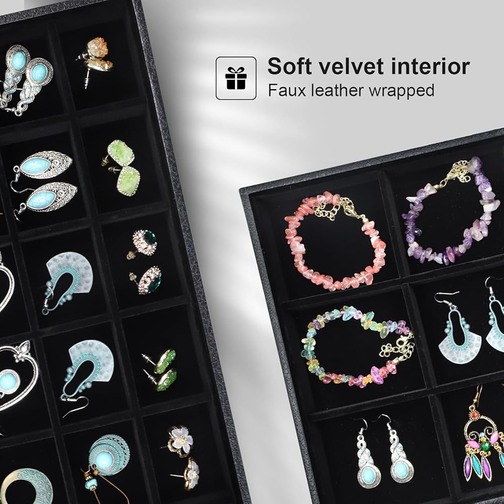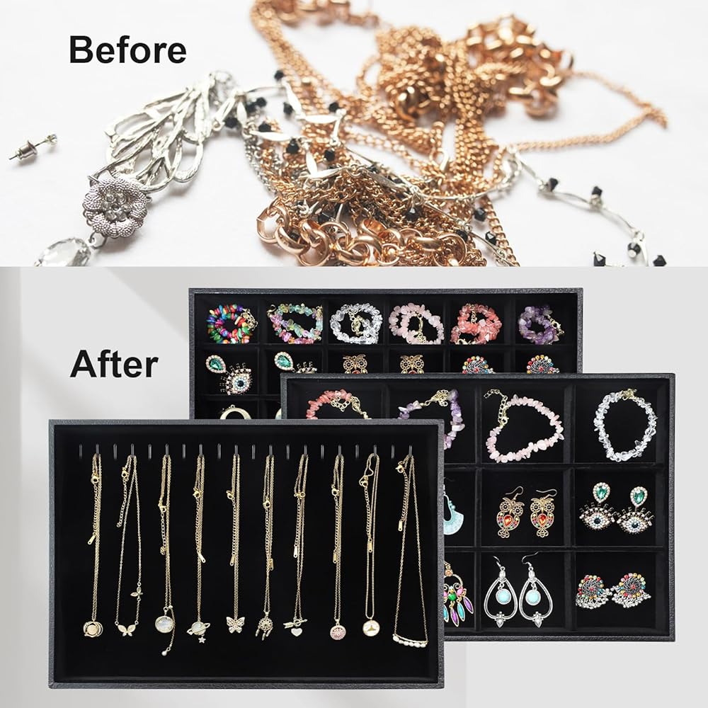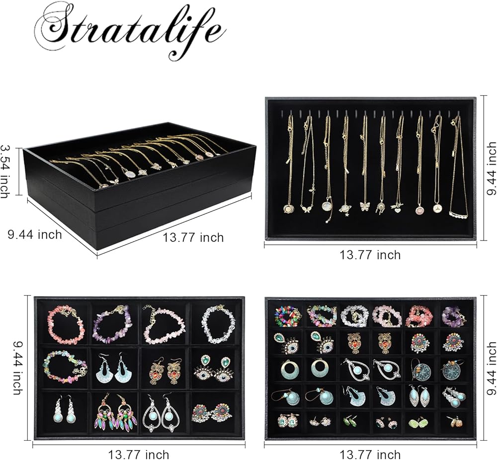 منظم المجوهرات للدرج: يبلغ مقاس كل صينية 13.8 (طول) × 9.5 (عرض) × 1.2 (ارتفاع) بوصة. يعمل تركيبها المسطح على تثبيتها للتكديس مما يناسب تمامًا درج خزانة الملابس الخاص بك، مما يحمي مجوهراتك من الخدوش والتلف. مثالية أيضًا لتخزين وعرض مجوهراتك في المنزل أو في المتجر.