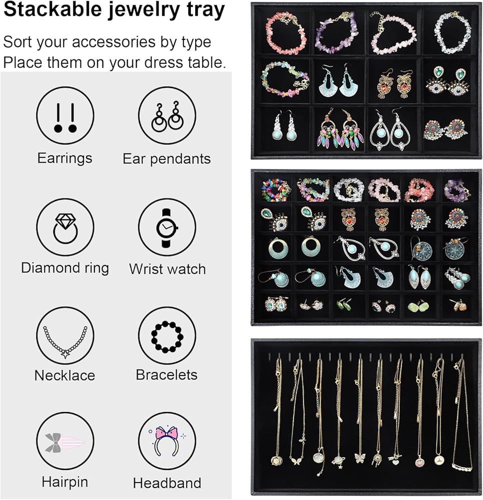 صواني المجوهرات القابلة للتكديس: توفر المادة المخملية الموجودة في كل حشوة من المجوهرات وسادة فخمة لإدخال الإكسسوارات وإزالتها بسهولة، مما يوفر لك لمسة مريحة. توفر صواني المجوهرات القابلة للتكديس هذه المساحة من الأقراط والخواتم إلى القلائد والأساور لخزانة الملابس والخزانة الخاصة بك.
