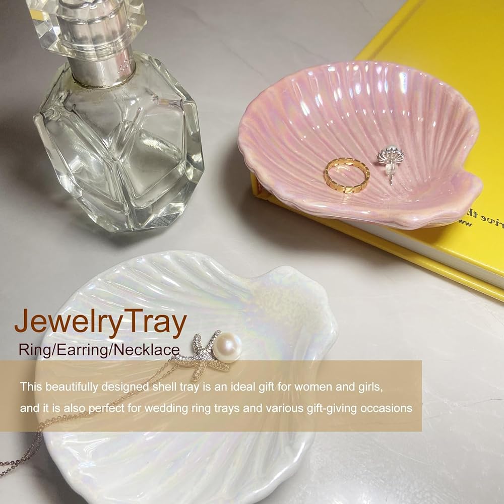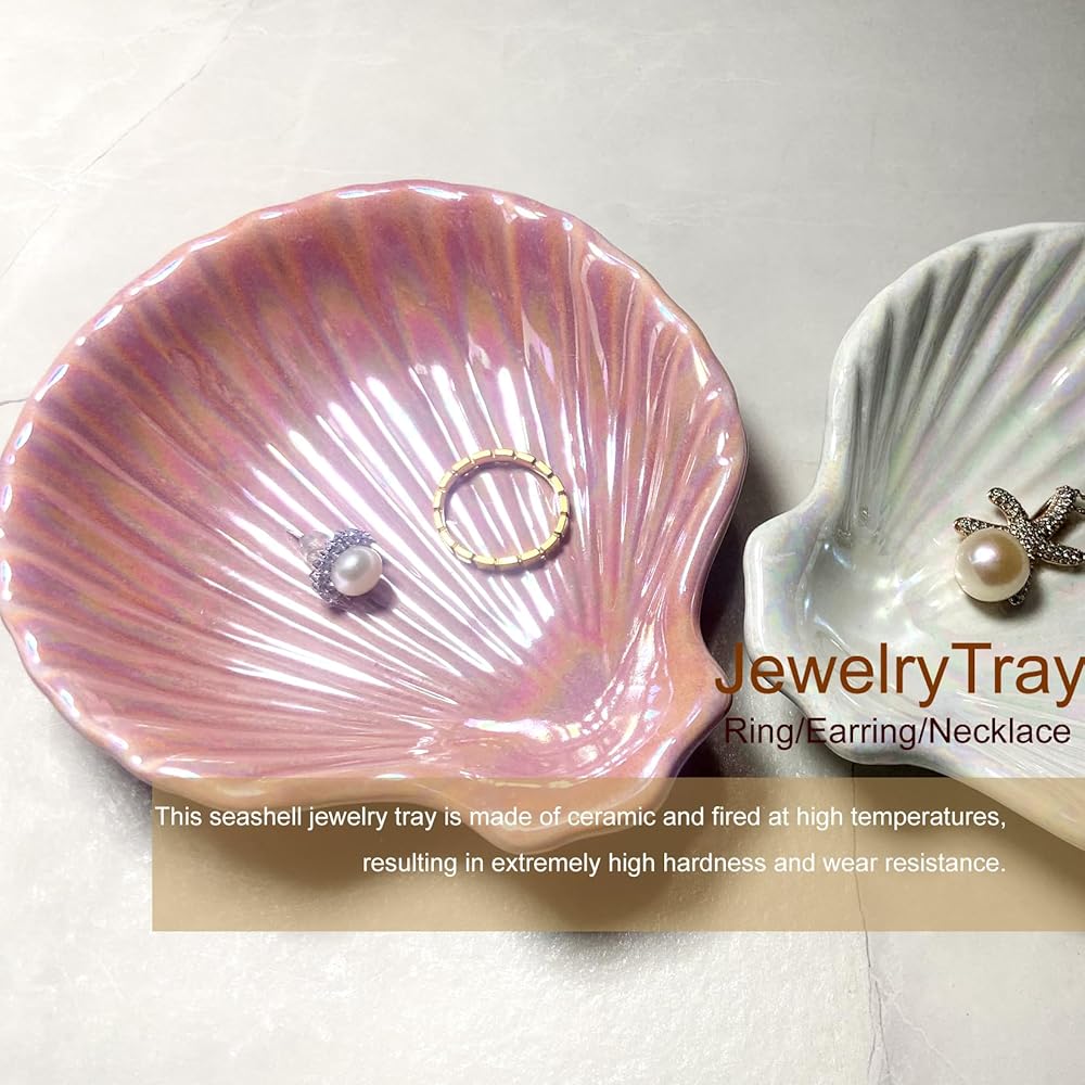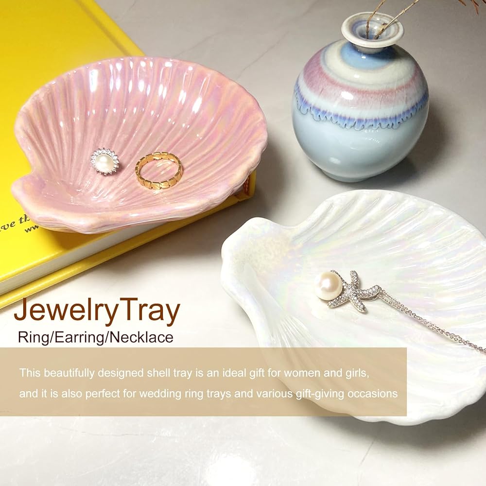 جينتيسون 2 قطعة من السيراميك حامل مجوهرات على شكل حلقة/حلق/قلادة صينية طبق على الشاطئ الساحلي ديكور صدف، منظم مجوهرات مزخرف باللونين الأبيض والوردي