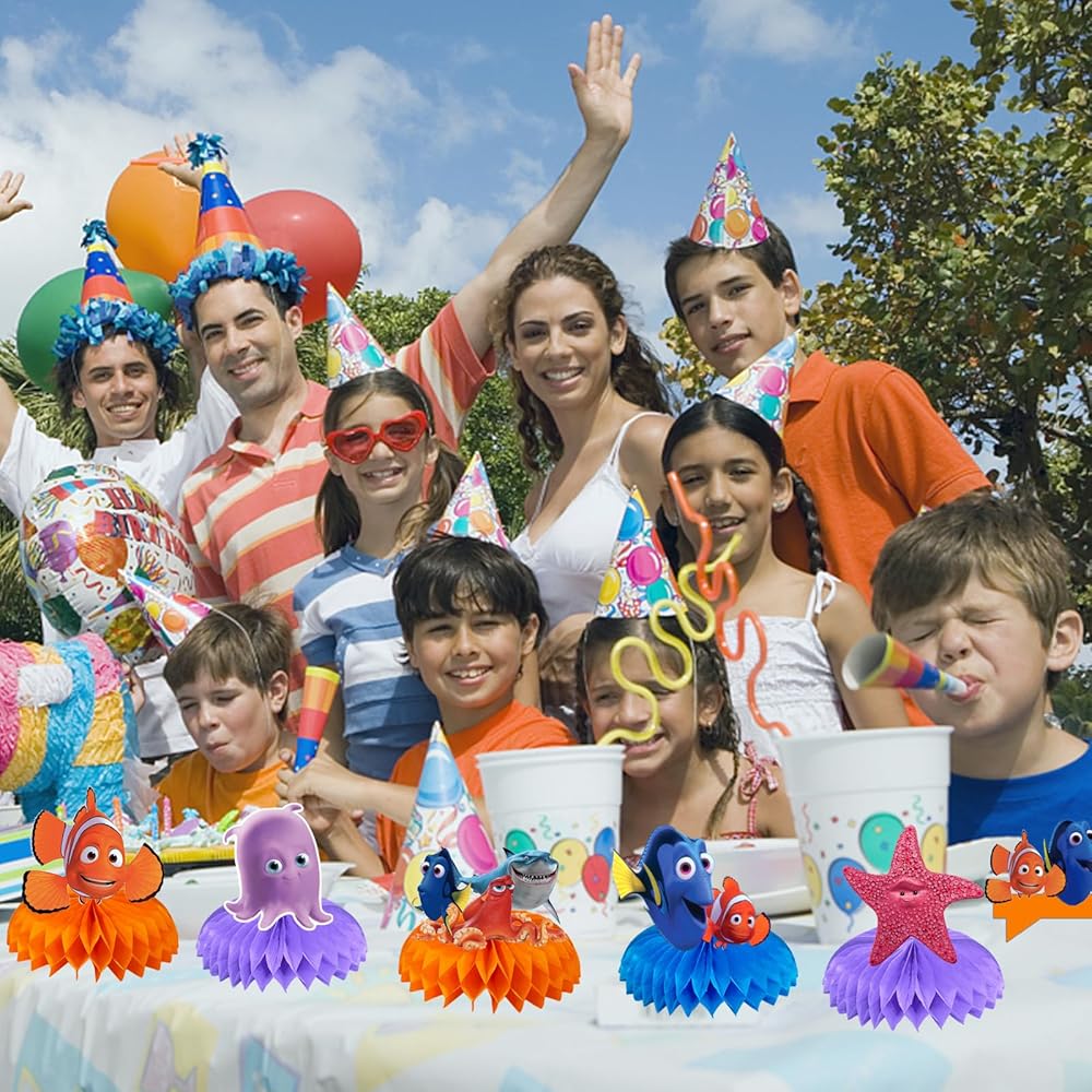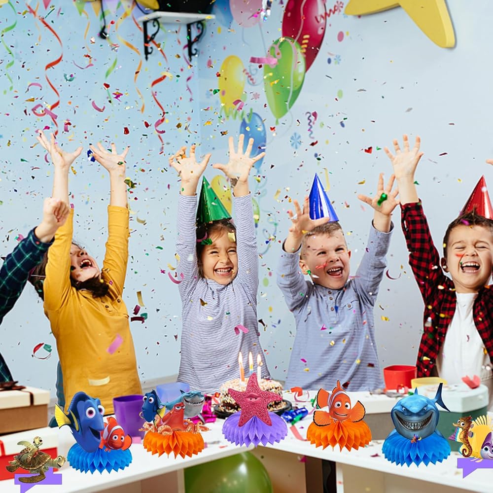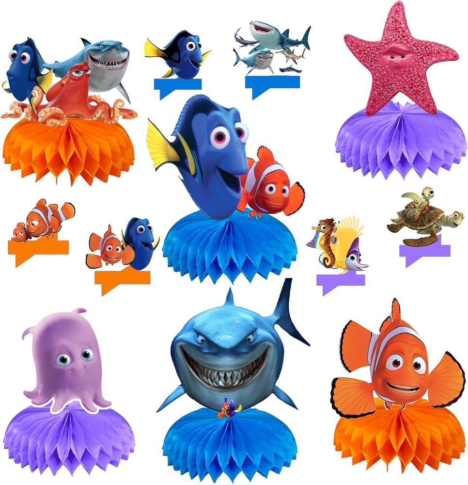 12 قطعة من لوازم حفلات البحث عن نيمو، قطع مركزية على شكل قرص العسل من نيمو ثلاثية الأبعاد مزدوجة الجانب للعثور على زخارف حفلات نيمو، ديكور سطح المكتب لحفلات أعياد ميلاد الأطفال