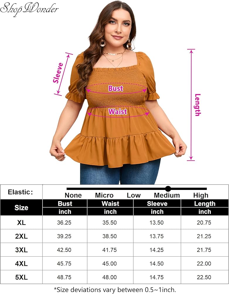 ميزة المقاسات الكبيرة: ShopWonder هي علامة تجارية يمكنها إنتاج ملابس نسائية ذات مقاسات كبيرة، لذلك لا داعي للقلق بشأن المقاس. من 1XL إلى 5XL، من المؤكد أنك ستجد الحجم الذي تحتاجه. يوجد جدول المقاسات أدناه حتى تتمكن من المقارنة لاختيار المقاس المناسب لك.