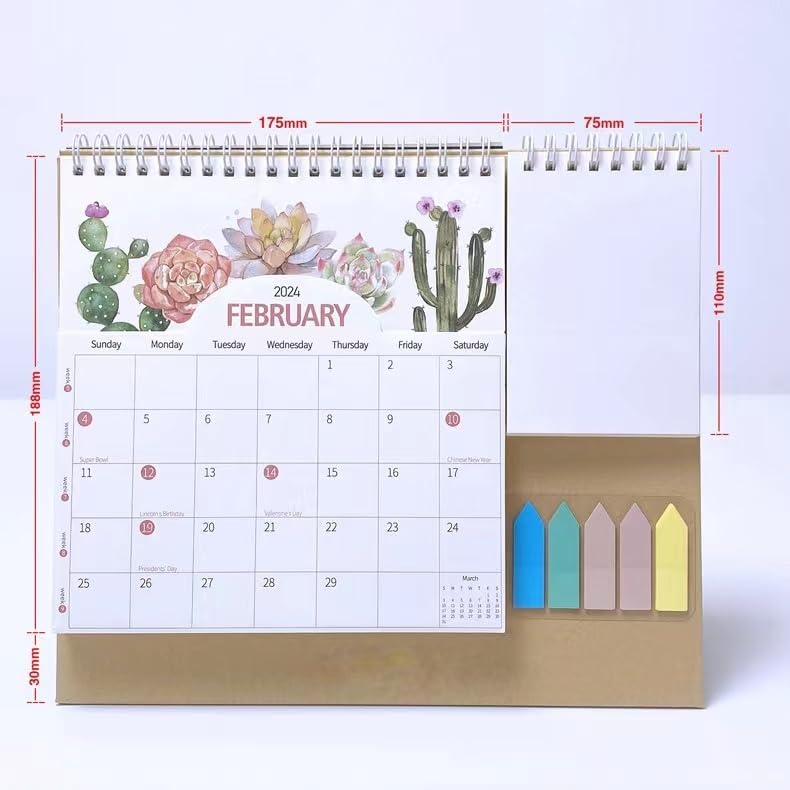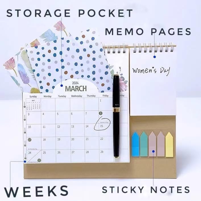 This desk calendar covers 12 months from Jan 2024 to Dec 2024 with the major holiday listed. And the size of 9.8" x 8.6" is perfect for your desk, suitable for home, school, office, etc. There's creative storage pocket on every month page. It's convenient to storage your pen, card or paper etc. Also there‘re sticky notes and memo pages. You can jot down your important dates, your appointment, your thoughts, your ideas etc and you can tear down the notes at any time conveniently. Papers of the calendar are strong and thick that you will not need to worry about ink bleed-through. We hope to provide you a comfortable and wonderful experience by this desk calendar. Thanks for your choice and trust. If you meet any problems during use, please contact us at the first moment. And we will provide suitable solution you like.