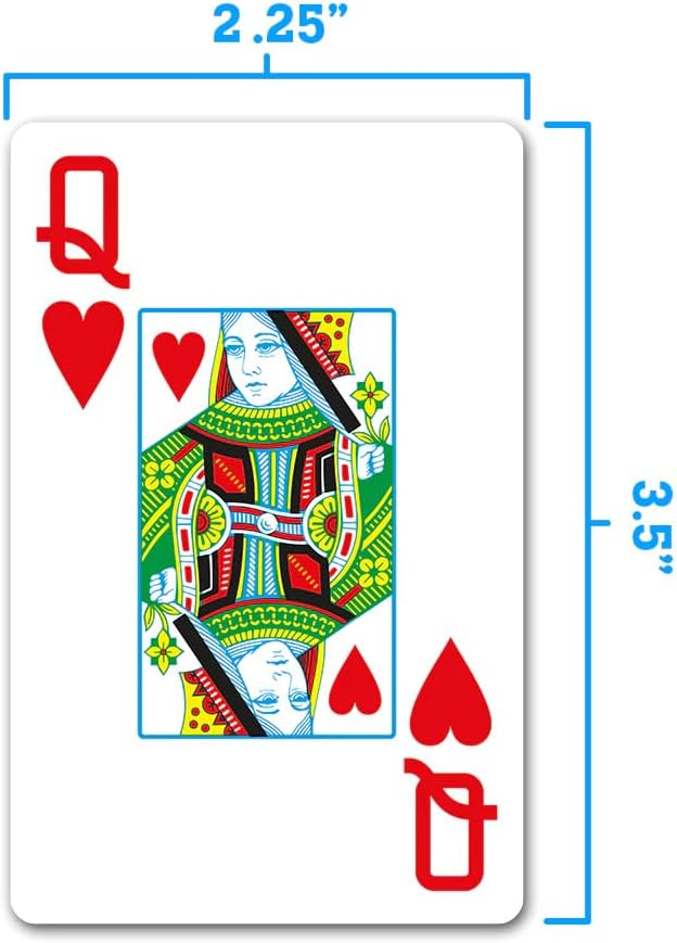These are two regulation-narrow size (bridge) decks that measure 2.25-by-3.5-inches (W x H), and are made of practically indestructible PVC plastic material for years of use. Completely washable via a quick wipe with a damp cloth, the cards won't soil over time. Each deck includes 52 cards and 2 jokers. These cards were lightly used in tournament play at the 2023 World Series of Poker.